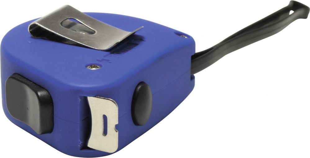 5 m Trak z merilnikom v palcih in centimetrih v mehkem gumijastem ohišju s ključavnico, nosilnim pasom in sponko za pas.