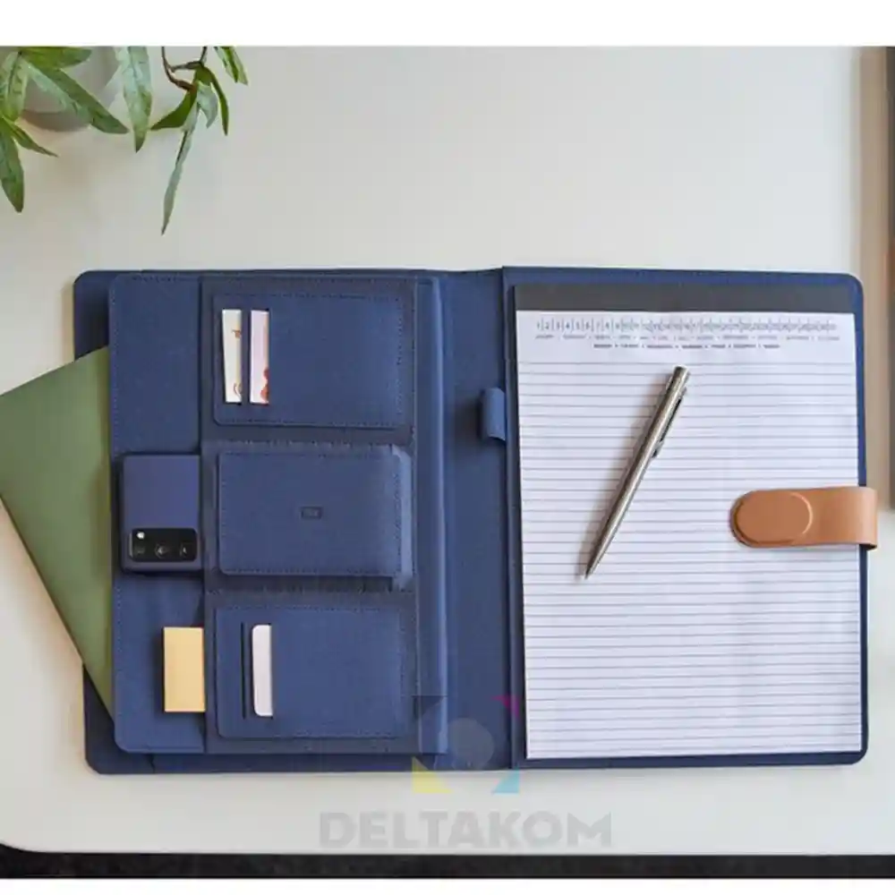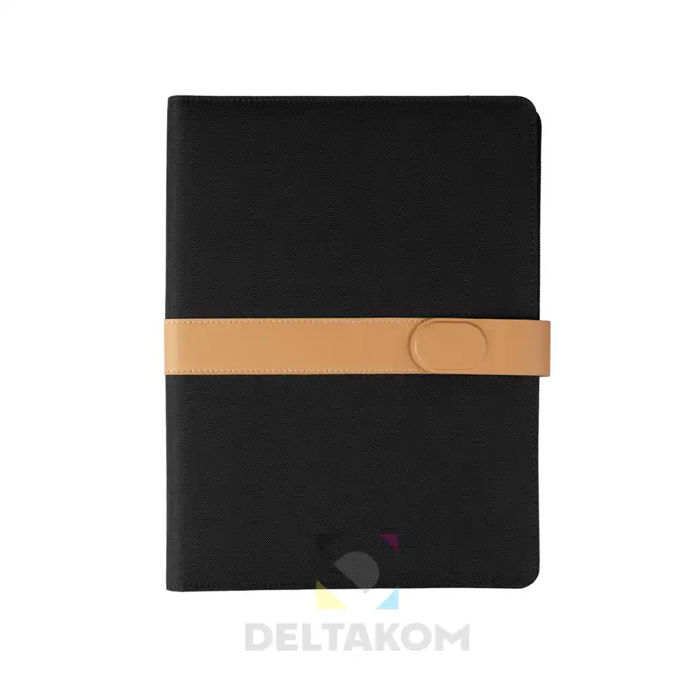 Konferenčna mapa velikost A4, vključuje zvezek z 20 črtastimi stranmi, predelki za dokumente, zanka za pisalo, magnetno zapiranje, posamezno pakirano v kraft ovoju, izdelek iz RPET materiala.