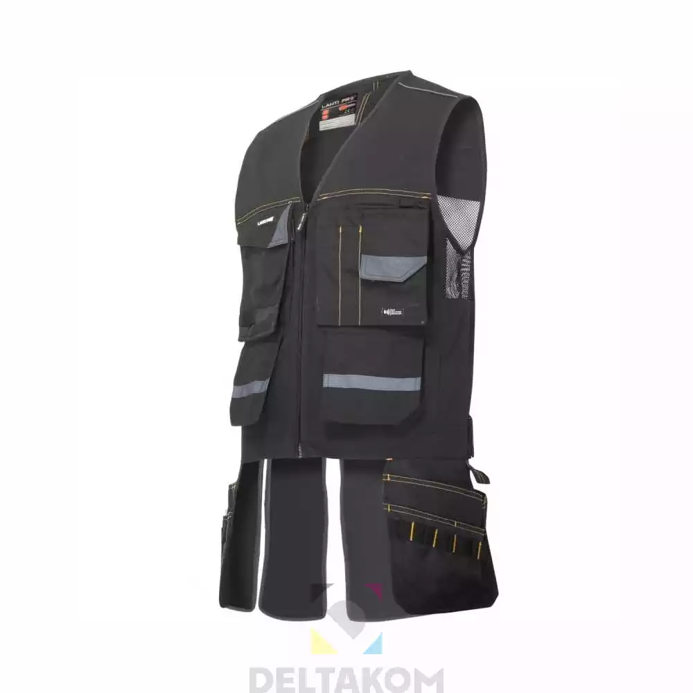 - 21 žepov, vključno z 2 zaprtima z zadrgo. Ohlapno viseči žepi na telesu ob strani za večje udobje med delom. Prilegajoči se žepi iz trpežnega poliestrskega materiala Oxford 600D z možnostjo pritrditve v notranjost telovnika. Prilagodljivi sprednji žepi z dodatno ojačitvijo iz poliestrskega materiala Dobby Oxford in zankami za pas za dodatke.