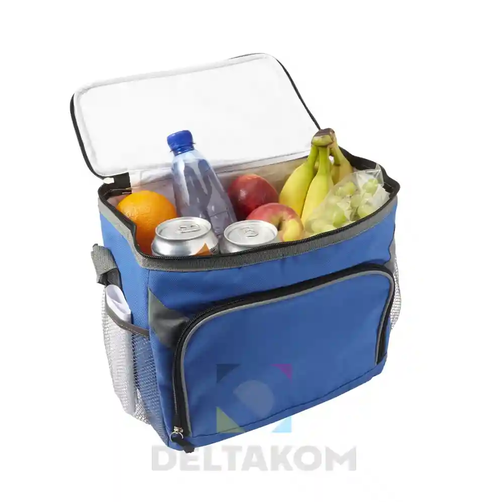 Pravokotna hladilna torba iz poliestra (600D) z dodatnim sprednjim žepom z zadrgo in mrežastimi straskimi žepi na obeh straneh.