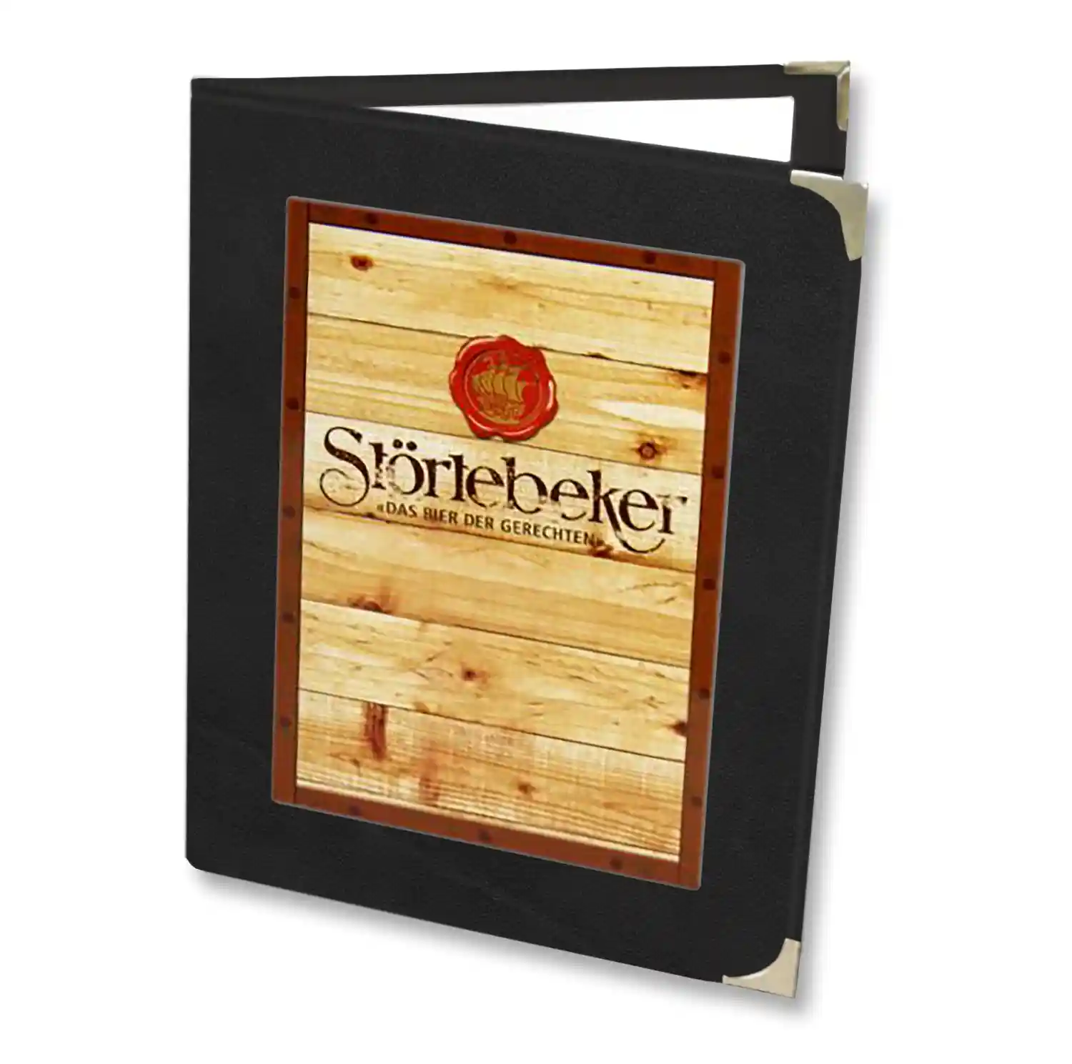 4 knjižni vijaki v notranjosti mape, veliko okno 25 x 17 cm za vaš logotip na sprednji platnici, ki je plastificiran in všit v platnico.