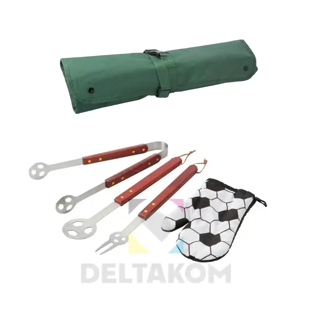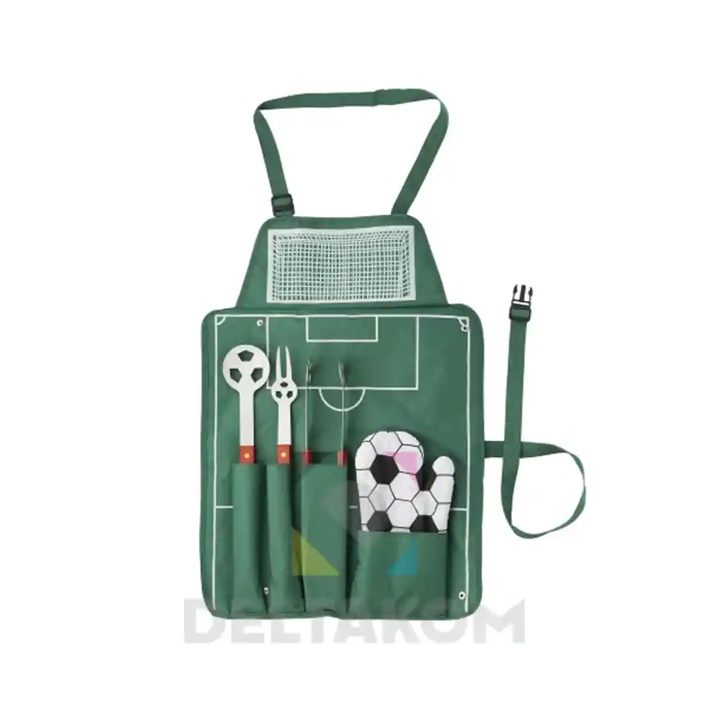 Nogometni BBQ žar set je postavljen v zeleni predpasnik z designom nogometnega igrišča, vključuje lopatico, vilice in klešče z lesenimi ročaji in rokavico.