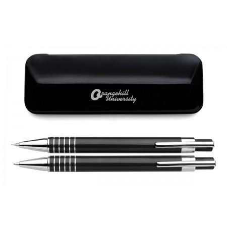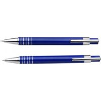 Pisalni set iz aluminija, sestavljen iz lakiranega kemičnega svinčnika s črnim črnilom in tehničnega svinčnika.