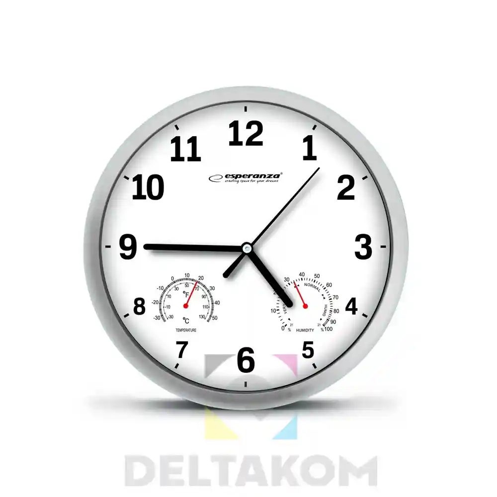 Stenska ura Esperanza LYON se ne uporablja le za prikaz časa – odčitava tudi temperaturo in vlažnost okolja. Njen dizajn vam omogoča, da okrasite vsako stanovanje, pisarno, trgovino ali restavracijo.