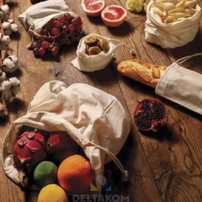 Nakupovalna torba iz organskega bombaža z zapenjanjem na vrvico. Na voljo v različnih velikostih.