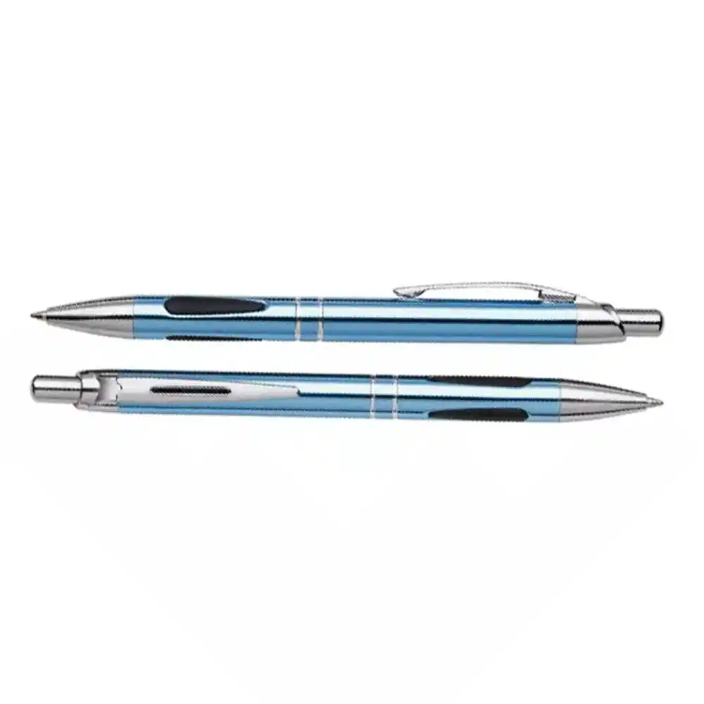 Opis Kovinski kemični svinčnik s tremi ergonomskimi gumijastimi blazinicami.