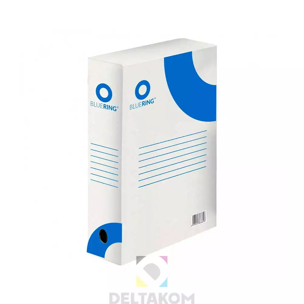 Arhivska škatla karton A4 100 mm za hitro shranjevanje dokumentov in registratorjev. Trpežen karton, širina hrbta 10 cm, izvlečna luknja in možnost označevanja.