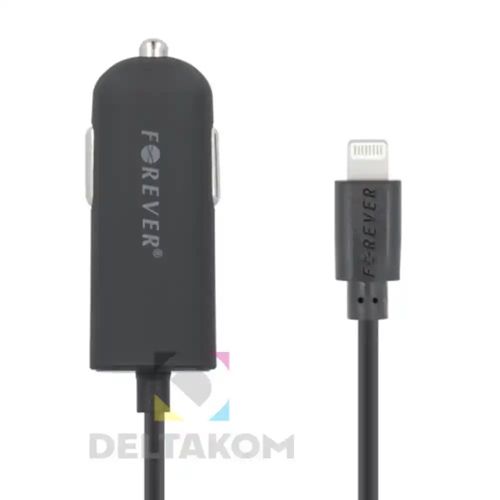 Avtopolnilec Forever M-02 za iPhone z 8-pin Lightning priključkom. Črn avtomobilski polnilec 1A z 1,20 m kablom za hitro in varno polnjenje med vožnjo.