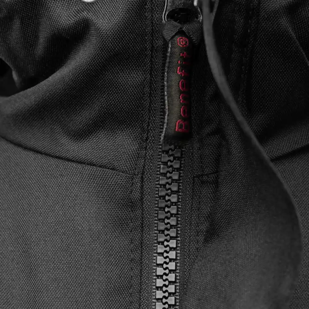 Način zapiranja: zapenjanje z dvojnim zadrgo, prekrito s ploščico s pritisknimi gumbi. Material: 100 % poliester – OXFORD/PVC, nepremočljiv, vodoodporen. Izolacijski material: 100 % poliester, gramatura 200 g/m2. Podloga: 100 % poliester, prešita z ogrevalnim podložnim materialom – to preprečuje premikanje podložnega materiala.