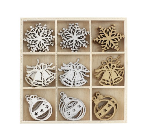 BOŽIČNI LESENI OKRASKI 2 – set lesenih okraskov z božičnimi motivi, idealen za dekoracijo smrečice in prazničnih aranžmajev.