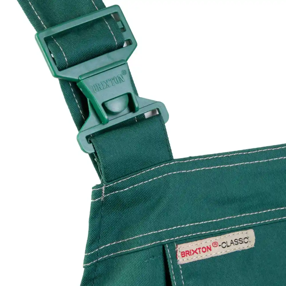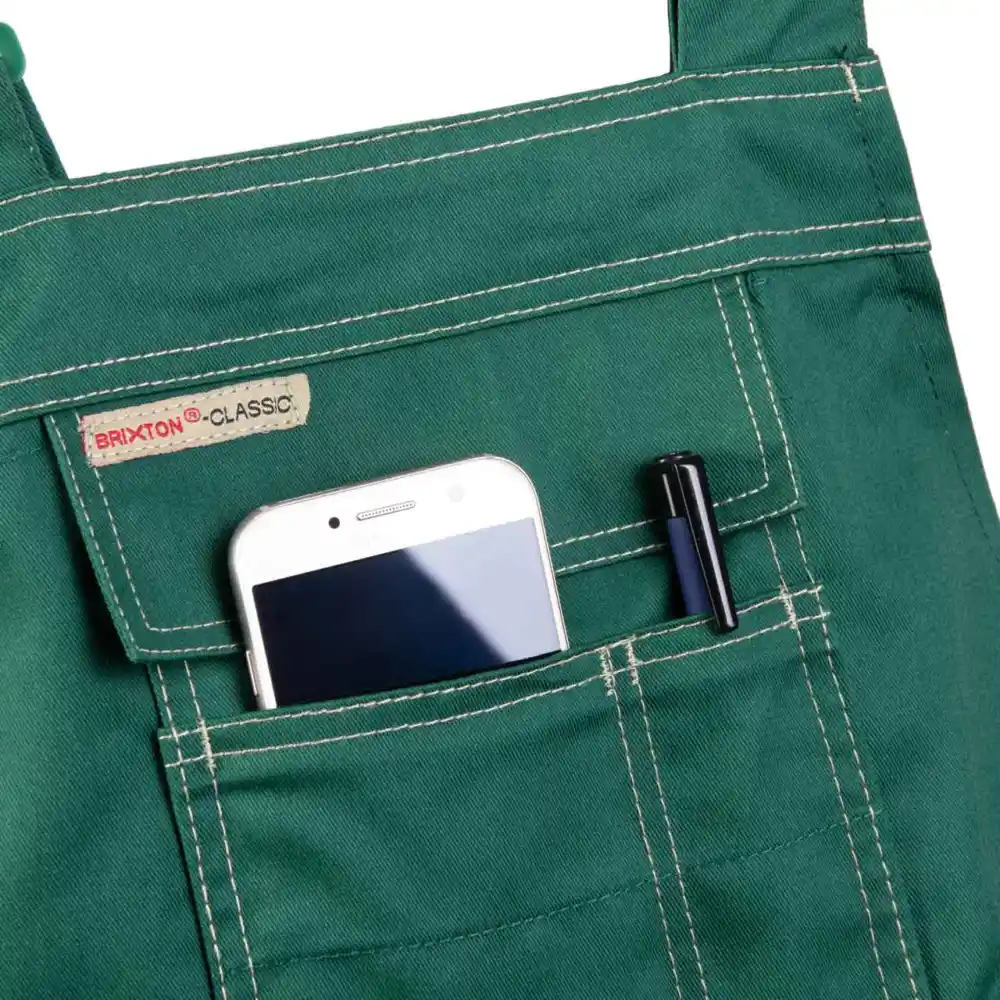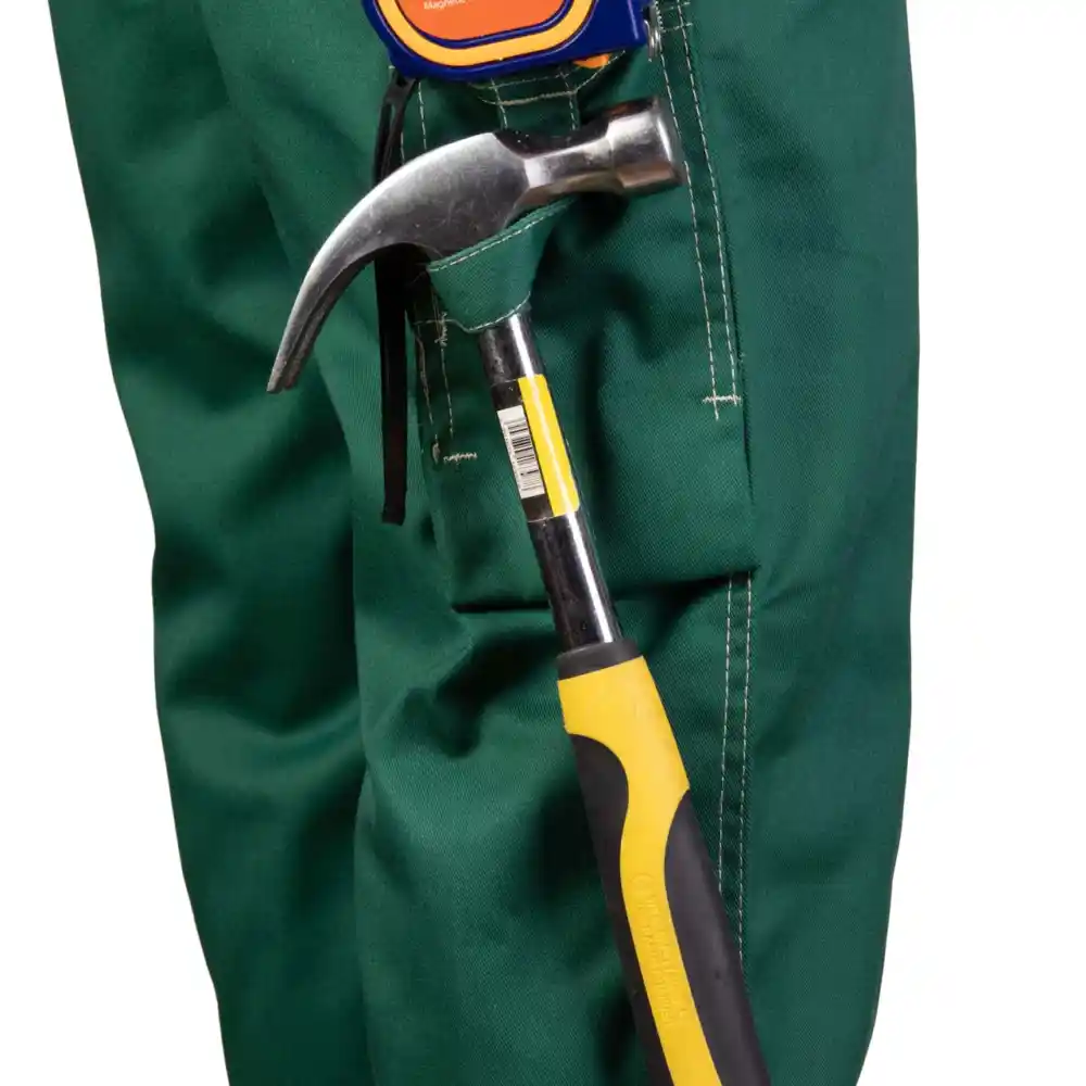 veliko število zaklepnih šivov na mestih, ki so še posebej izpostavljeni raztrganju, nastavljiv pas z gumbi in elastičnim trakom, prišit na zadnji del hlač, dolge, široke, nastavljive naramnice, dva stranska žepa, ojačena stranska žepa, ojačan žep z velcro zapenjanjem, žep za mobilni telefon, žep za pisalo, žep za merilni trak, pasna zanka za kladivo, dvojni šivi, šivani z močno vidno nitjo, izdelani iz visokokakovostnega materiala, ki zagotavlja stabilnost barve in velikosti po večkratnem pranju, notranji žep za dokumente z zadrgo.