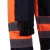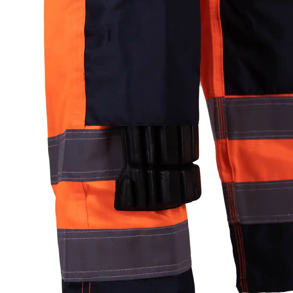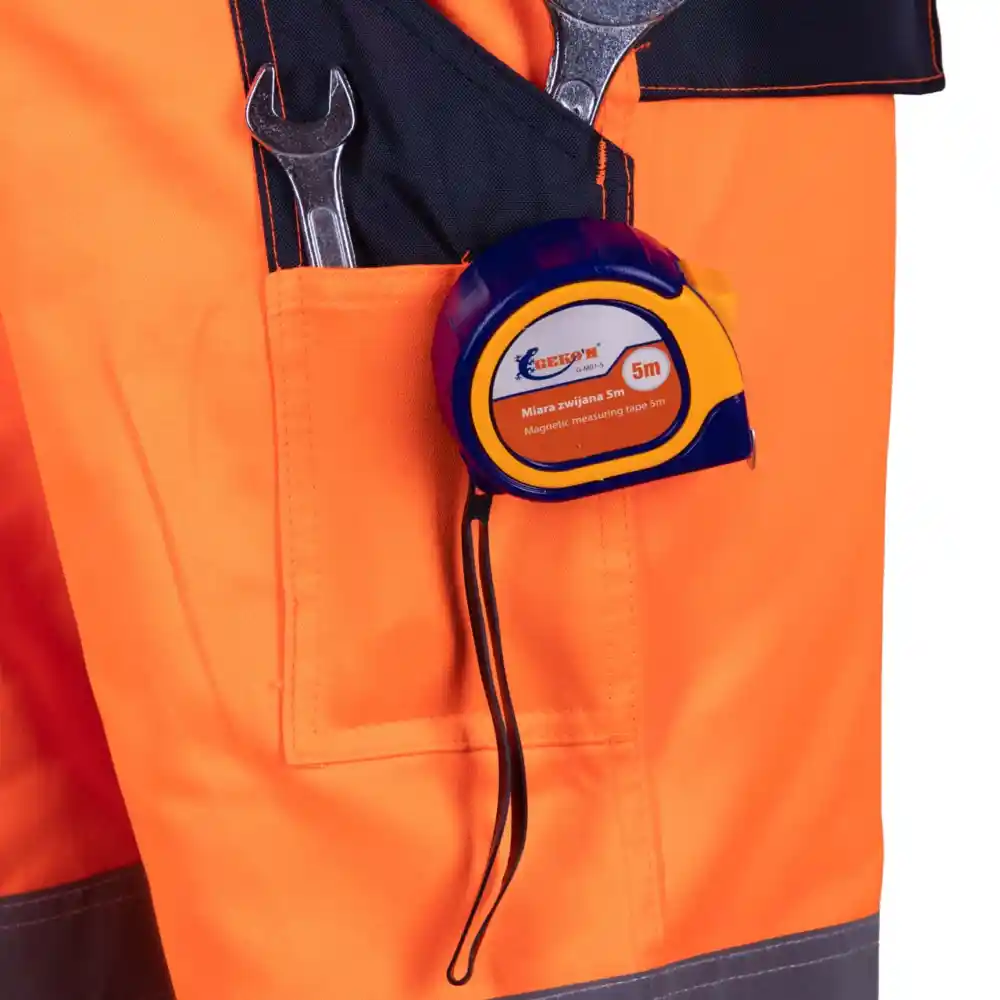 Žepi: žep za merilni trak, dva stranska žepa, prostrani žepi, žep za dokumente, ergonomski žep za kolenske blazinice iz OXFORD-a, žep z zadrgo, dva žepa na zadnjem delu hlač, z velcro zaponkami. Nastavitev pasu: nastavljiv pas zaradi elastičnega traku. Odsevni elementi: dvojni odsevni trakovi s fluorescenčnimi lastnostmi.