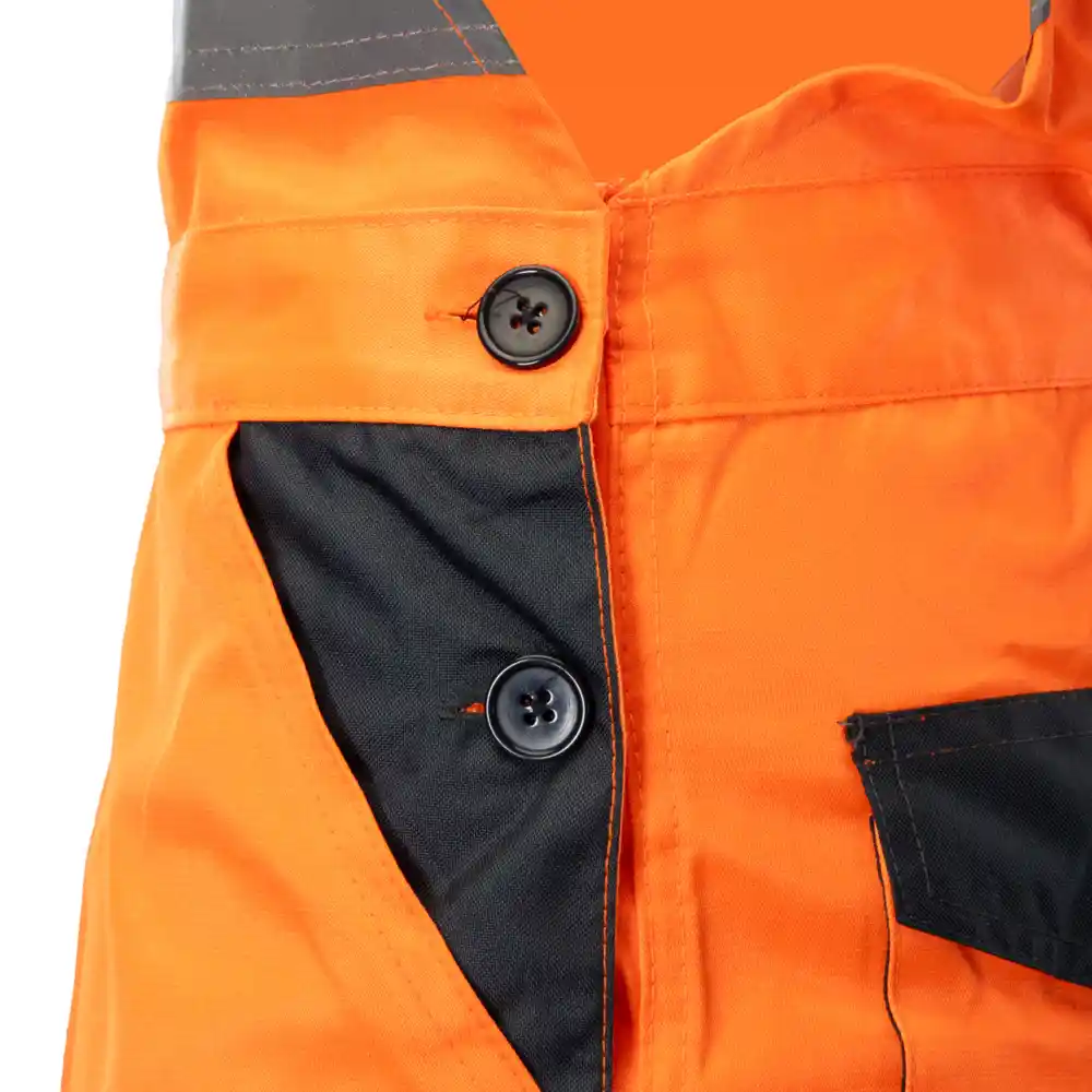 Naramnice: dolge, nastavljive naramnice. Material: izdelane iz visokokakovostnega materiala, ki zagotavlja stabilnost barve in velikosti po večkratnem pranju. Konstrukcija/šivanje: barvni vložki, veliko število zaklepnih šivov na mestih, ki so še posebej izpostavljeni raztrganju, hlače imajo v mednožju vstavek za večjo svobodo gibanja in udobje uporabnika, spodnji del hlačnic je izdelan iz OXFORD-a, pasna zanka za kladivo.