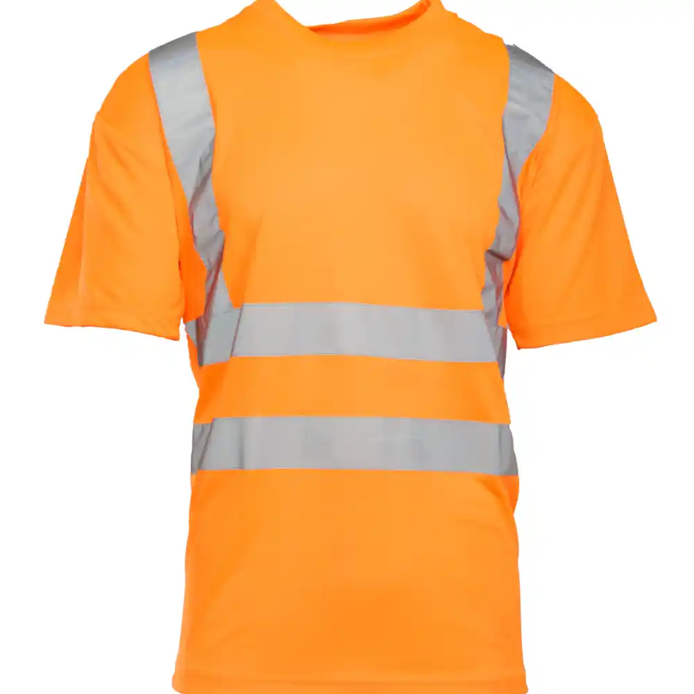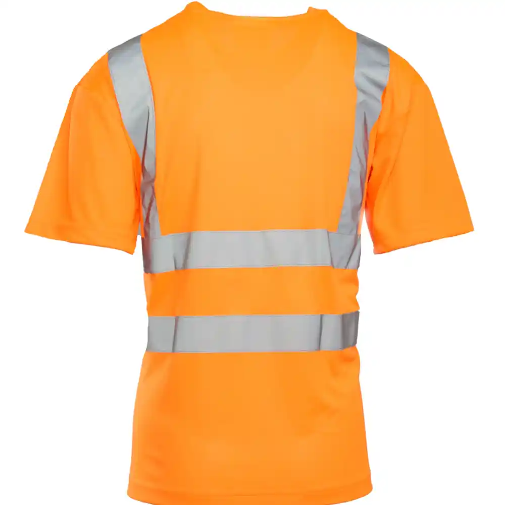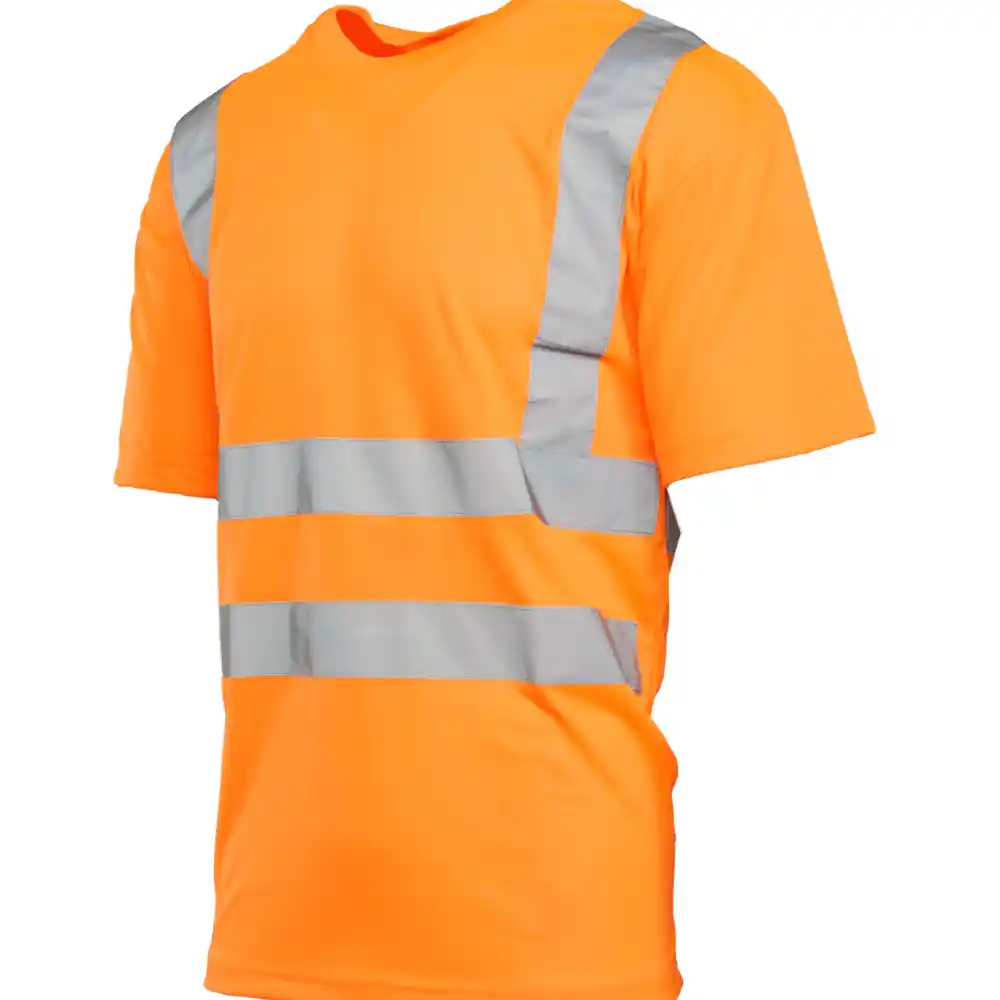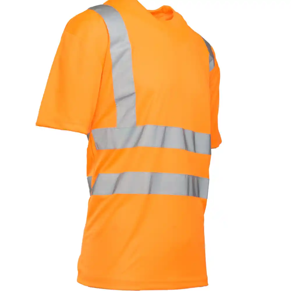 Material: 100 % poliester, elastična tkanina z visoko vidljivostjo. Konstrukcija/šivanje: opozorilna majica s kratkimi rokavi, elastični robovi, trpežni šivi, šivana z močno nitjo. Odsevni elementi: navpične in vodoravne črte, dvojni odsevni trakovi za večjo vidljivost.