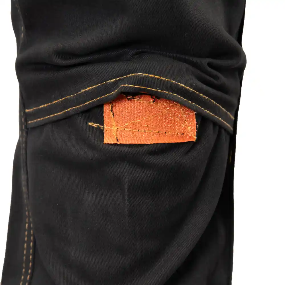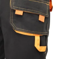 Žepi: prostrani žepi, dva stranska žepa, ojačani žepi z velcro zapenjanjem, žep za mobilni telefon, dva žepa za pisala, žep za dokumente, žep za merilni trak, ergonomski žep za kolenske blazinice. Nastavitev pasu: nastavljiv pas z gumbi in elastičnim trakom, prišitim na zadnji del hlač.
