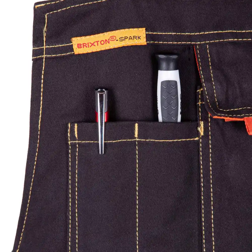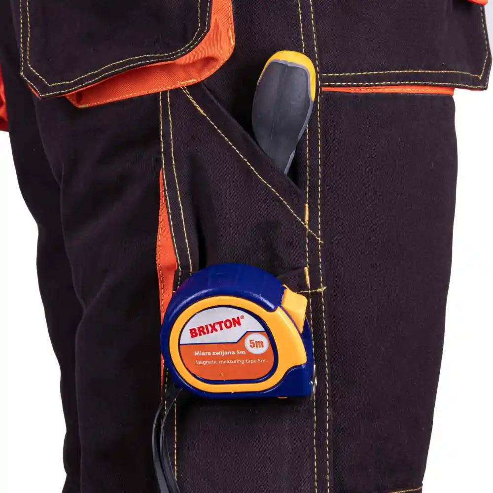 Konstrukcija/šivanje: dvojni šivi, šivani z močno vidno nitjo, veliko število zapornih šivov na mestih, ki so še posebej izpostavljeni raztrganju, pasna zanka za kladivo, črna. Žepi: žep za merilni trak, ojačani žepi z zapenjanjem na velcro, prostrani žepi, žep za dokumente, dva žepa za pisala, ergonomski žep za kolenske blazinice. Nastavitev pasu s pomočjo gumbov in elastičnega traku, všitega v zadnji del hlač.