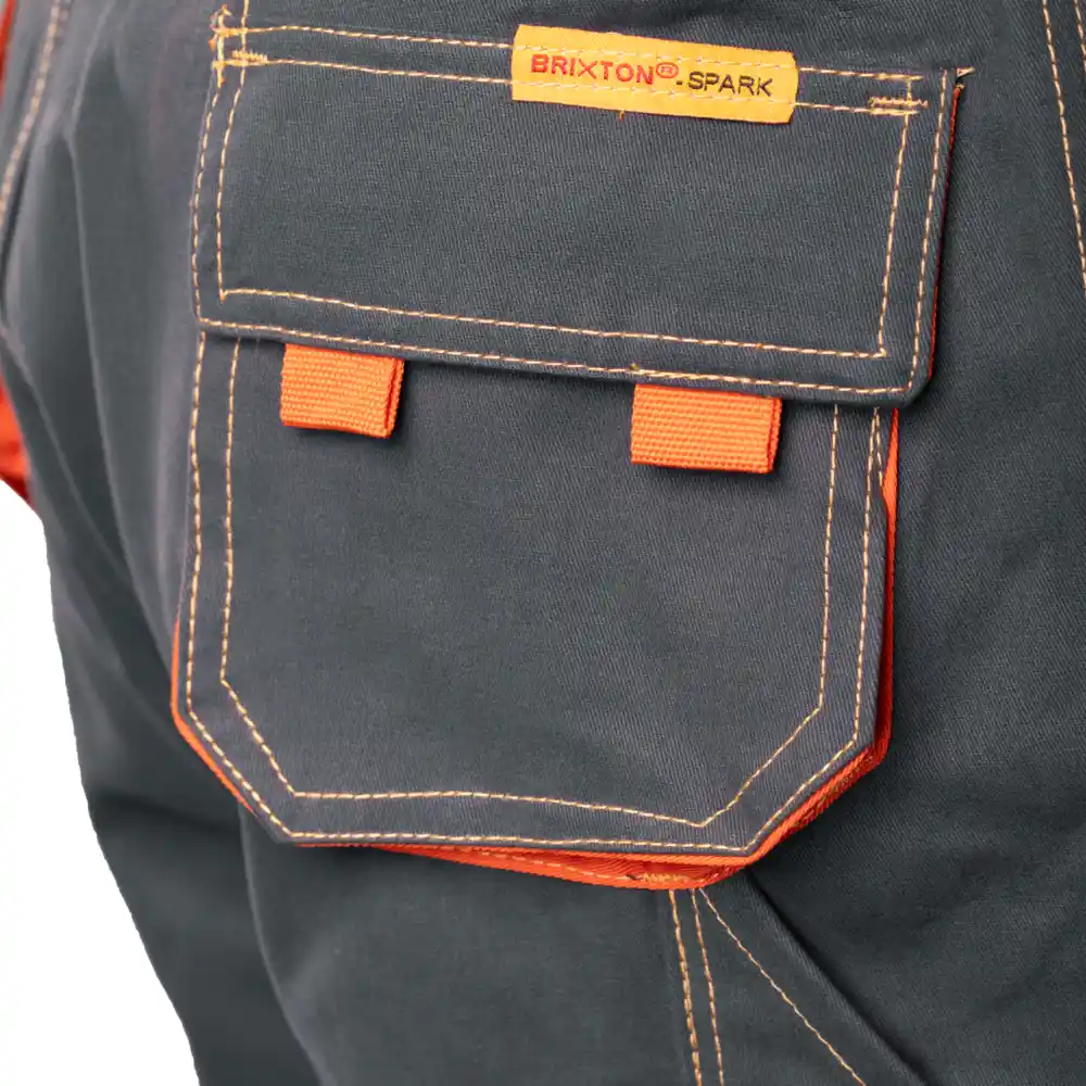 Material: izdelan iz visokokakovostnega materiala, ki zagotavlja stabilnost velikosti tudi po večkratnem pranju. Konstrukcija/šivanje: dvojni šivi, šivani z močno vidno nitjo, veliko število zaklepnih šivov na mestih, ki so še posebej izpostavljeni raztrganju, hlače z zančkami za pas, zančka za pas za kladivo. Žepi: žep za merilni trak, ojačeni stranski žepi, dva žepa na zadnjem delu hlač. Nastavitev pasu: nastavljiv pas zahvaljujoč elastičnemu traku.