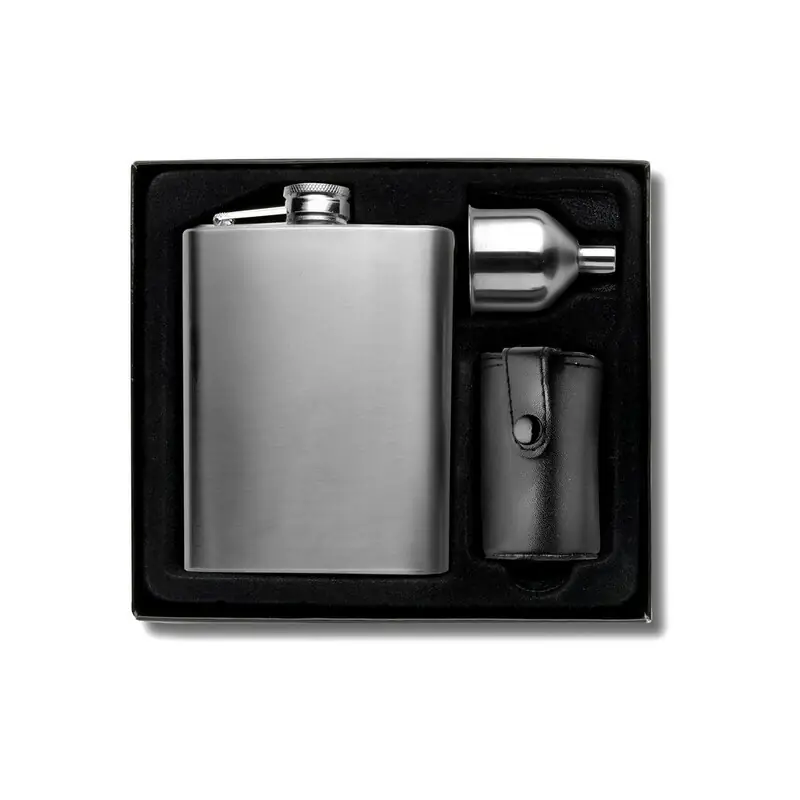 Komplet za pitje, steklenička 220 ml, 4 skodelice po 30 ml in lijak Material: nerjaveče jeklo. Dimenzije: 17 x 18 x 4,5 cm.