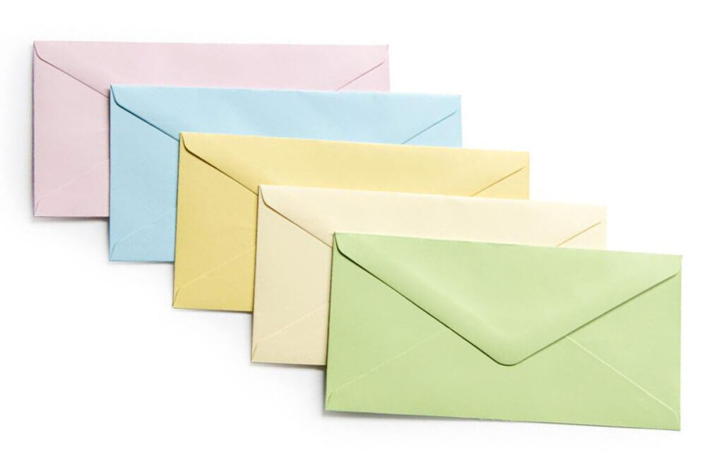 Kuverta 80 × 160 mm PASTEL, 130 g. Mokro zapiranje. Elegantne pastelne kuverte v barvah krem, rumena, zelena, modra, roza za vabila in voščilnice.