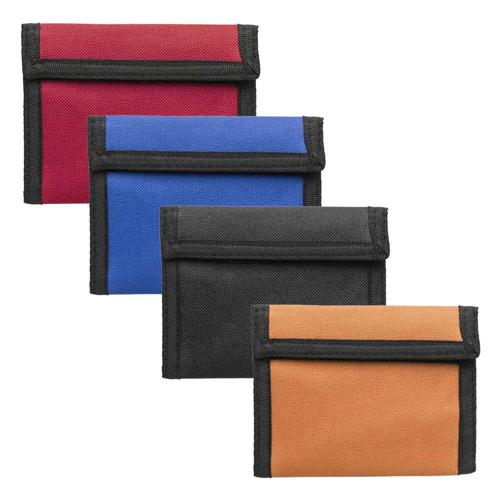 Denarnica iz poliestra z enim velikim žepom za bankovce in dvema manjšima žepoma.