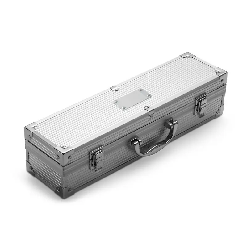 Komplet za žar v aluminijastem ohišju, vključuje lopatko, vilice in klešče Material: nerjaveče jeklo, aluminij, karton, netkani material, plastika. Dimenzije: dimenzije: 37 x 1 x 8 cm.