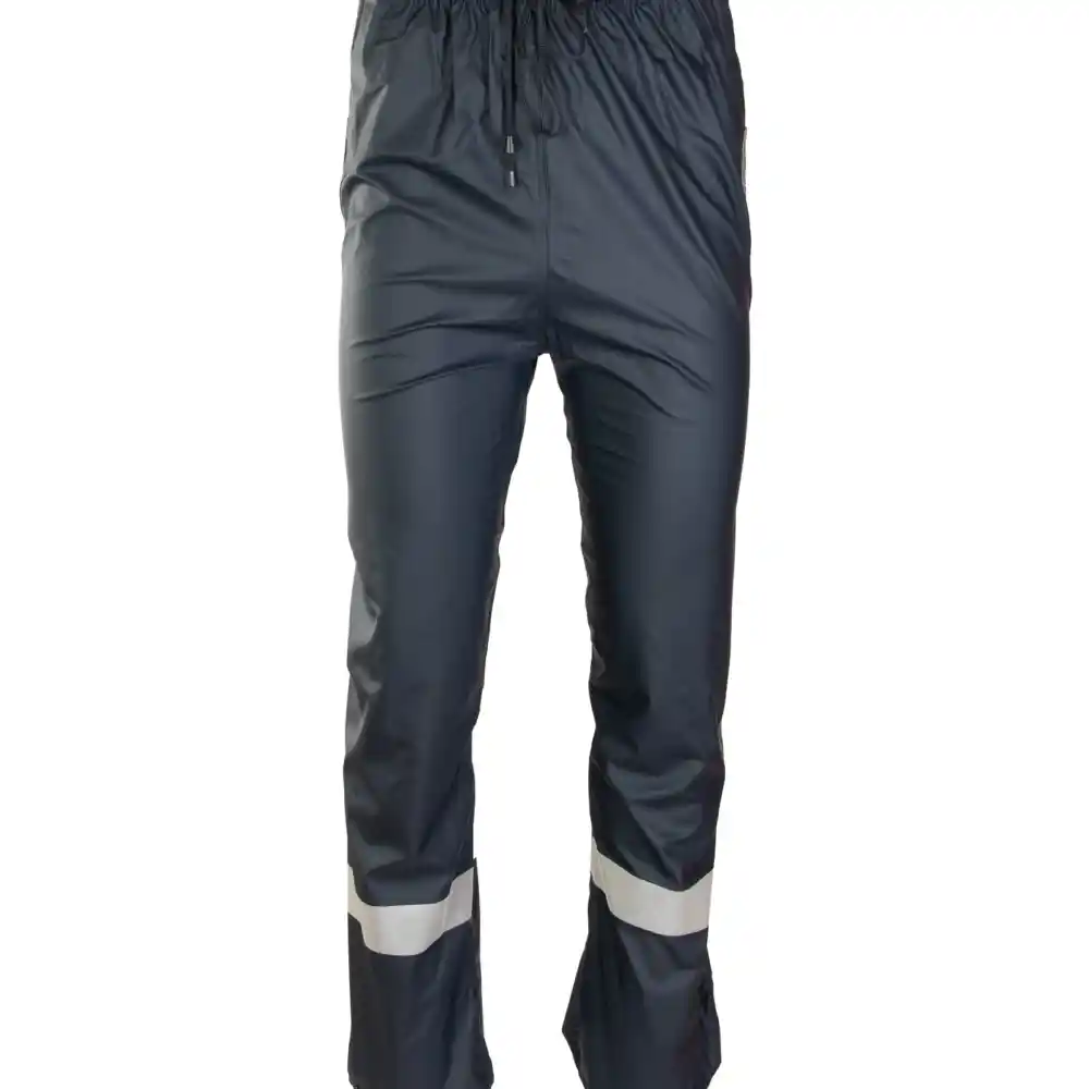 Material: 100 % poliuretan, debelina poliuretana – 0,4 mm. Konstrukcija/šivanje: temno modra, zelena, oranžna, rebrast pas, manšete na nogavicah. Žepi: prehodni. Odsevni elementi: odsevni trakovi.