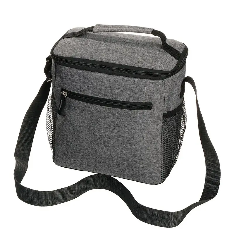 Hladilna torba, glavni predel in sprednji žep z zadrgo, 2 stranska mrežna žepa, ročaj za nošenje in nastavljiv naramni trak Material: poliester (300D), poliester (600D). Dimenzije: 25 x 15 x 24 cm.