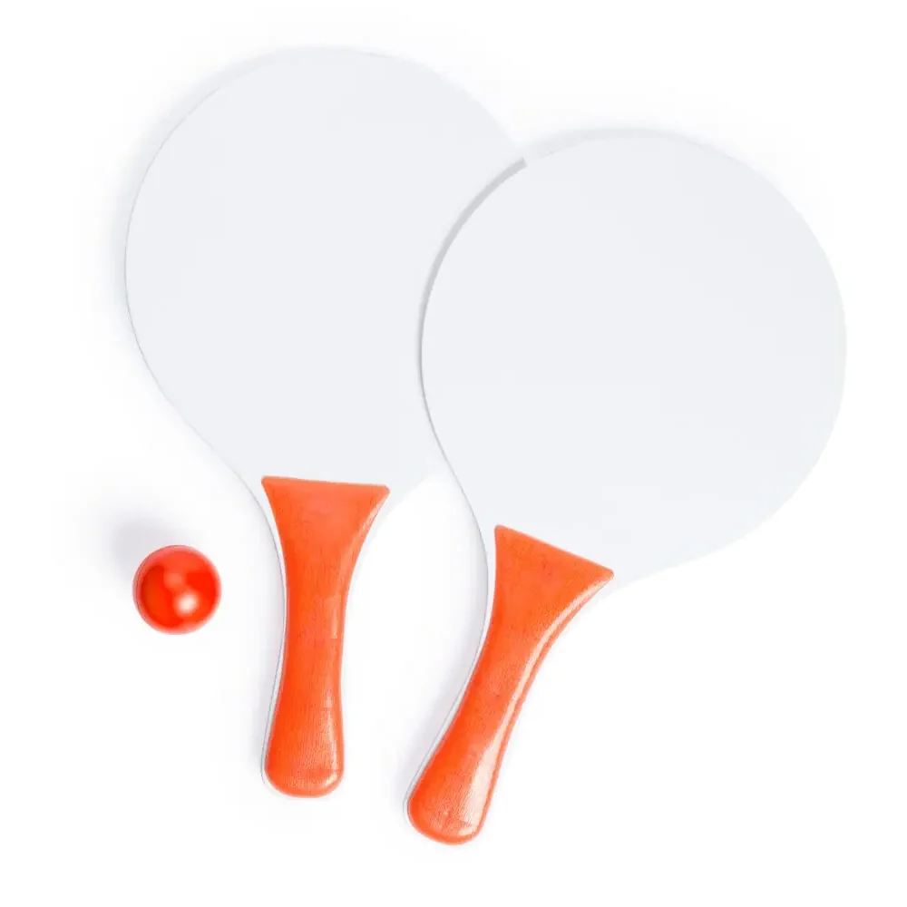 Par loparjev za plažo iz naravnega lesa z ojačanim ročajem v različnih svetlih tonih. Paketa sta v mrežasti vrečki z ustrezno barvno žogico. Material: les. Dimenzije: 19 x 33 x 0,6 cm.