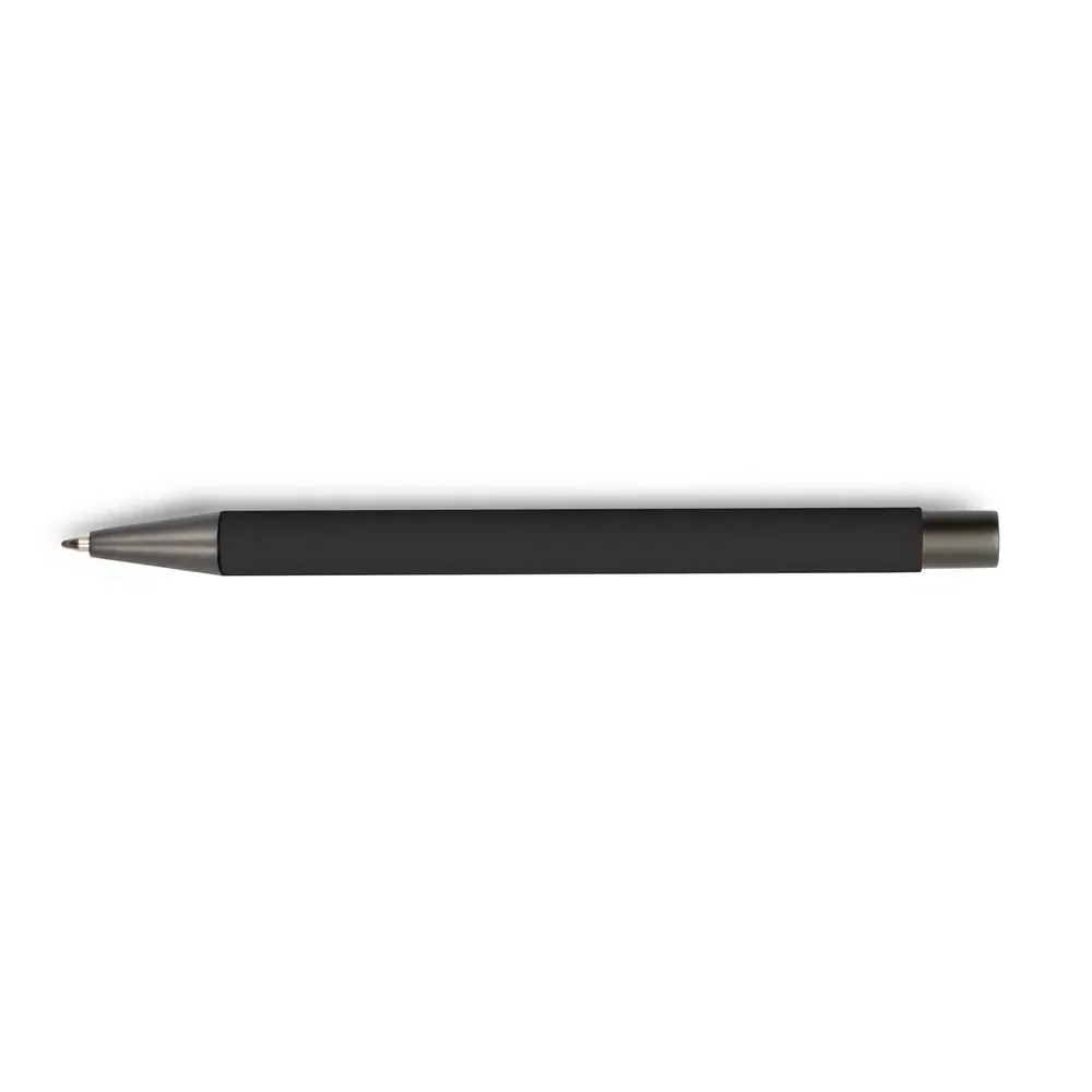 kemični svninčnik z barvnim ohišjem, s sivimi okrasnimi elementi in gumijastim premazom, piše z modrim črnilom; izdelano iz aluminija, plastike in kovine. Material: aluminij, plastika, kovina. Dimenzije: Ø1 x 13,7 cm.