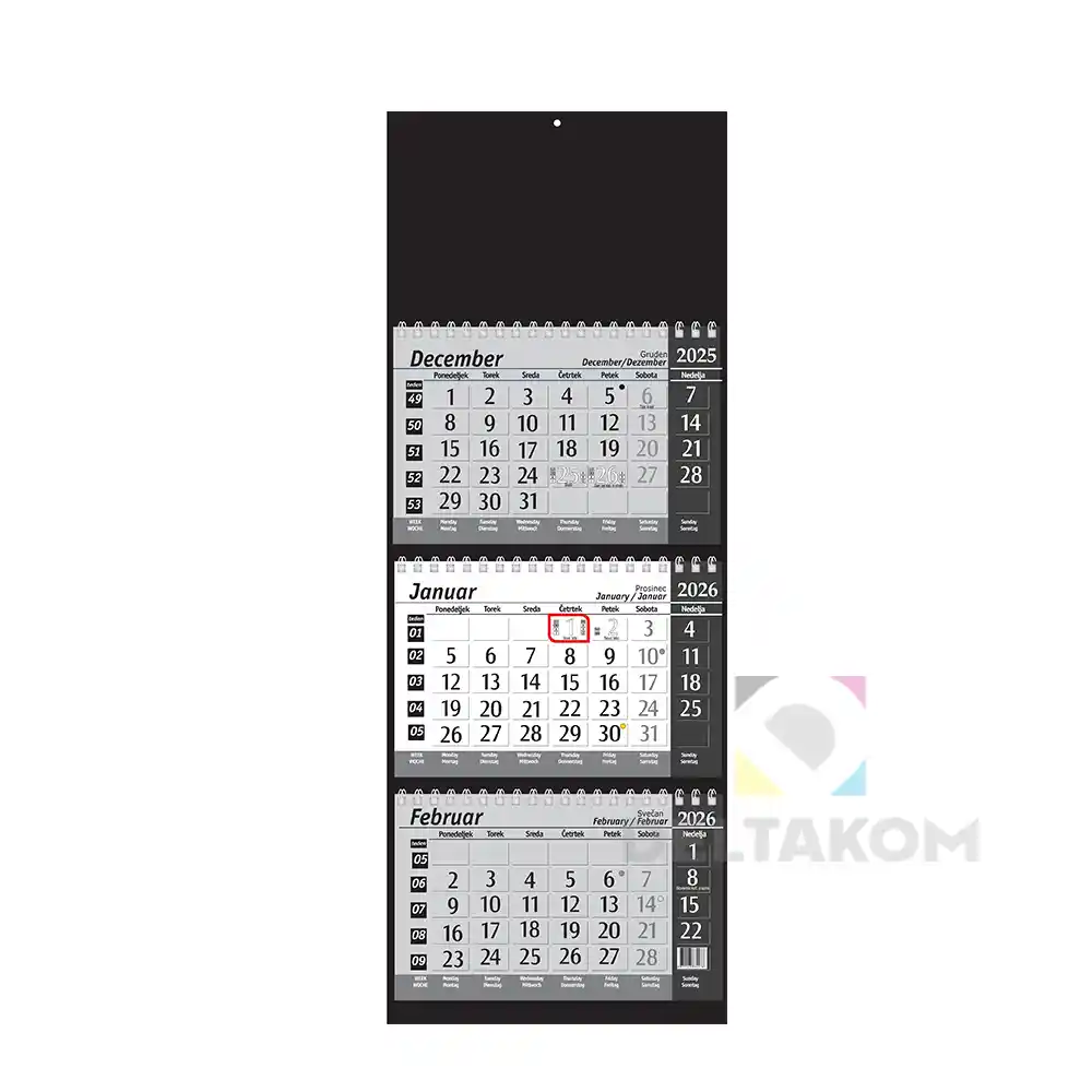 Koledar 3-DELNI ŠPIRALNI črn 2026 je praktičen poslovni koledar, ki omogoča trimesečni pregled na enem mestu. S črnim dizajnom in možnostjo dotiska logotipa je odlično promocijsko darilo za podjetja in poslovne partnerje.