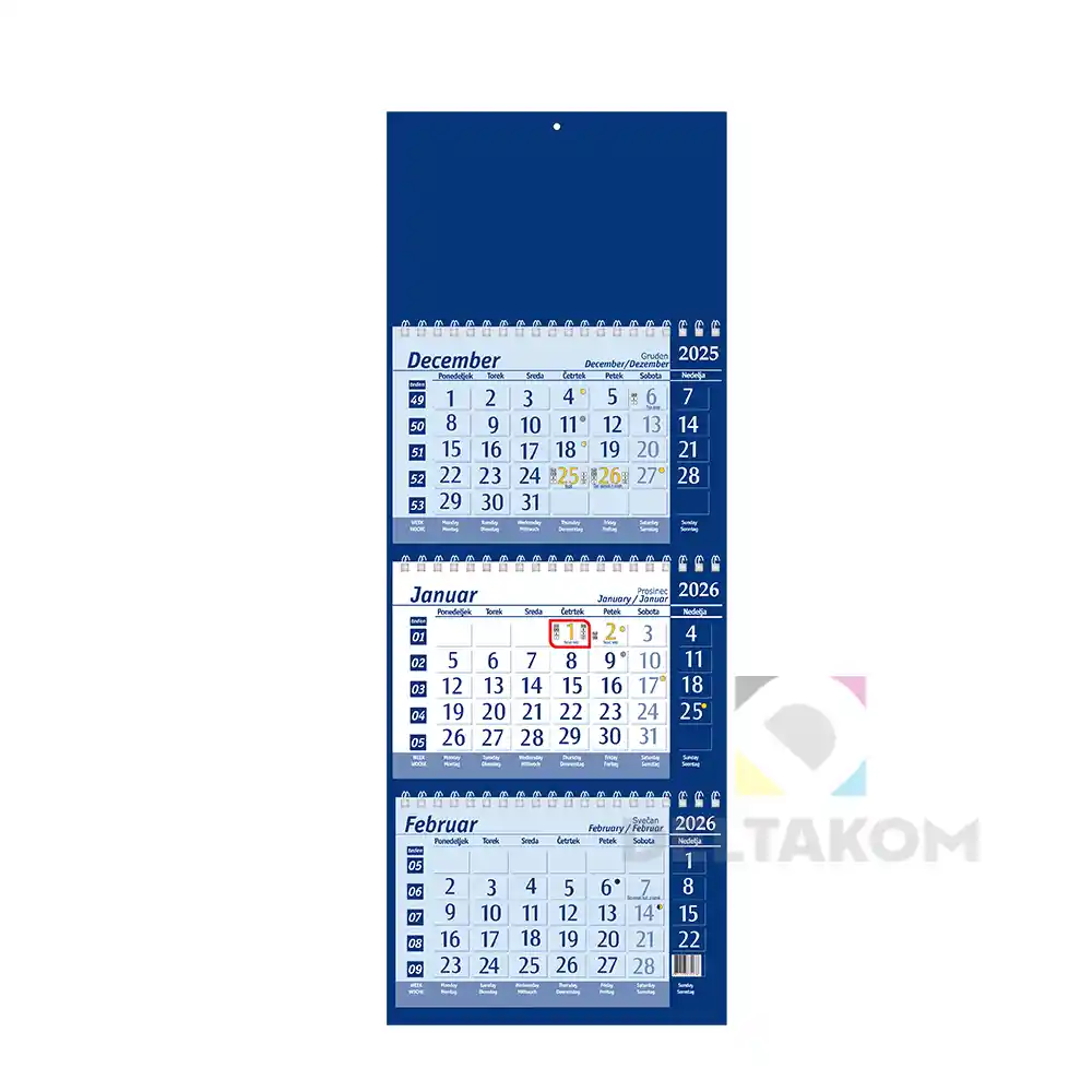 Koledar 3-DELNI ŠPIRALNI moder 2026 je praktičen poslovni koledar, ki omogoča trimesečni pregled na enem mestu. Z modrim dizajnom in možnostjo dotiska logotipa je odlično promocijsko darilo za podjetja in poslovne partnerje.