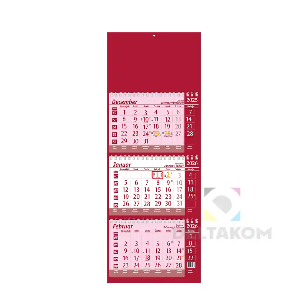 Koledar 3-DELNI ŠPIRALNI rdeč 2026 je praktičen poslovni koledar, ki omogoča trimesečni pregled na enem mestu. Z rdečim dizajnom in možnostjo dotiska logotipa je odlično promocijsko darilo za podjetja in poslovne partnerje.