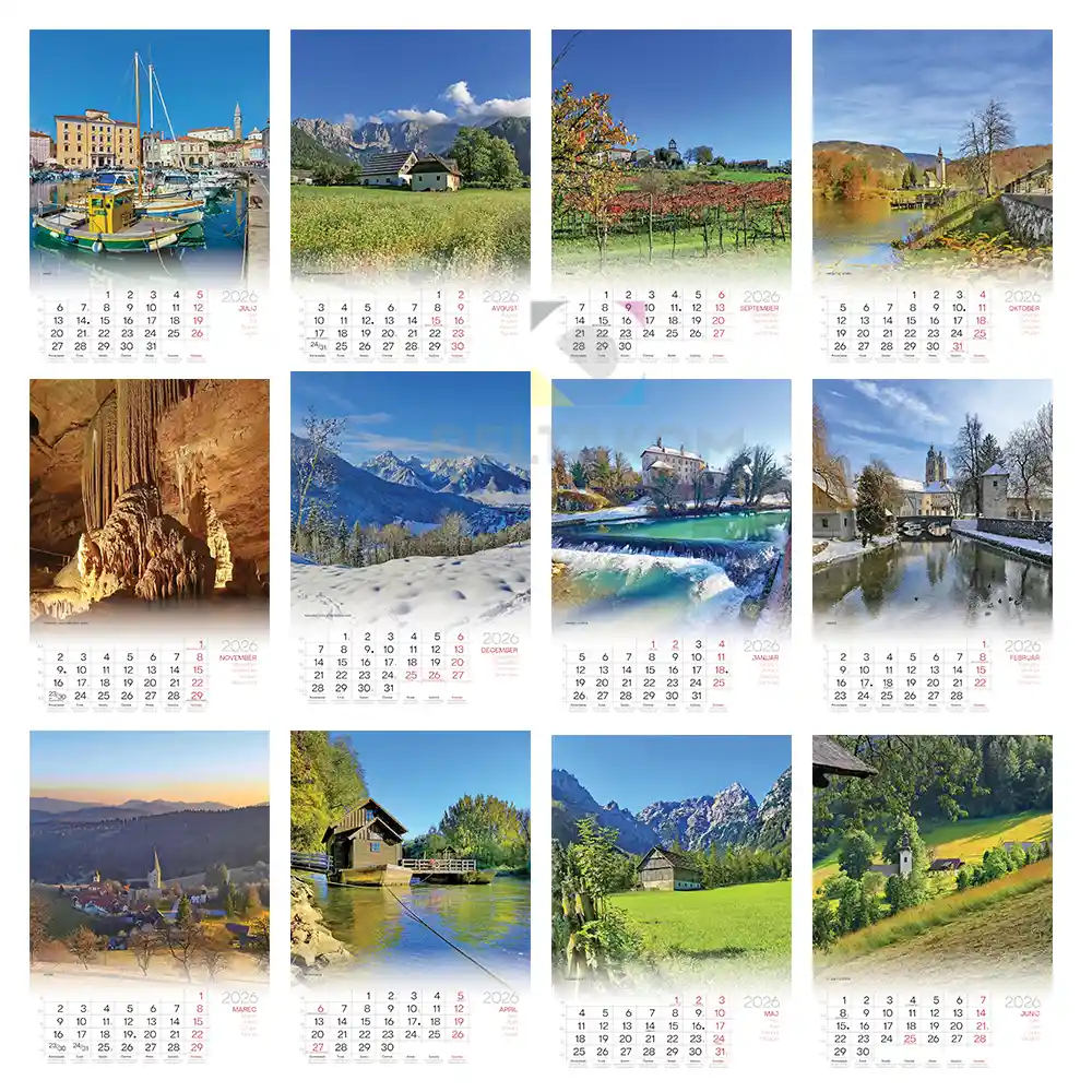 Koledar BISERI SLOVENIJE 2026 vas bo popeljal skozi slikovite pokrajine in kulturne znamenitosti Slovenije. Vsak mesec prinaša novo fotografijo, ki prikazuje naravne lepote in bogato dediščino naše države. Primeren je za domove, pisarne ali kot darilo s pridihom domačnosti.