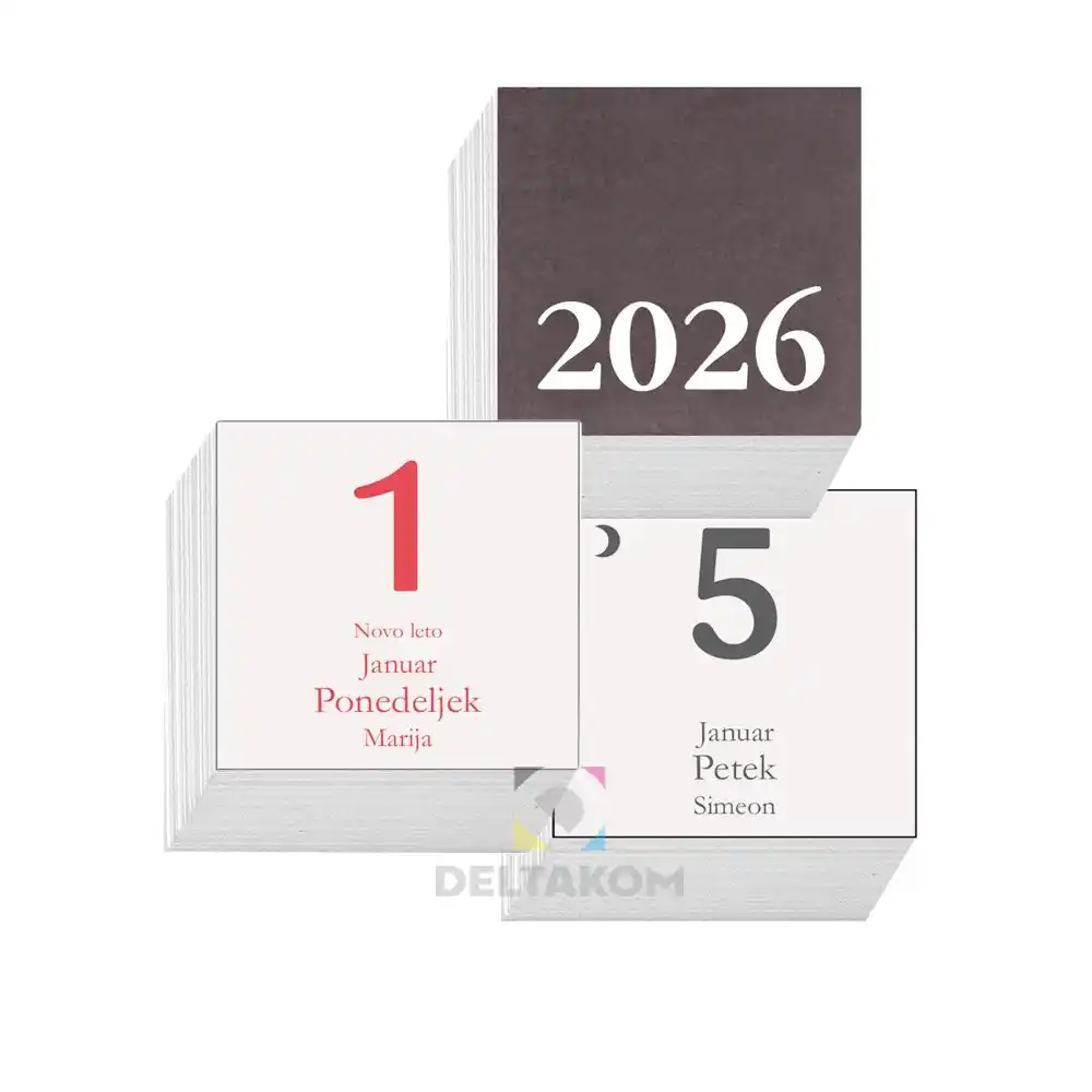 Koledar 2026 Kocka je majhen in praktičen koledar v dimenziji 45 × 45 mm, ki je idealen za pisarne, domače delovne mize ali kot promocijsko darilo. Zaradi svoje velikosti ne zavzame veliko prostora, hkrati pa ponuja vse potrebne informacije za vsakodnevno uporabo.