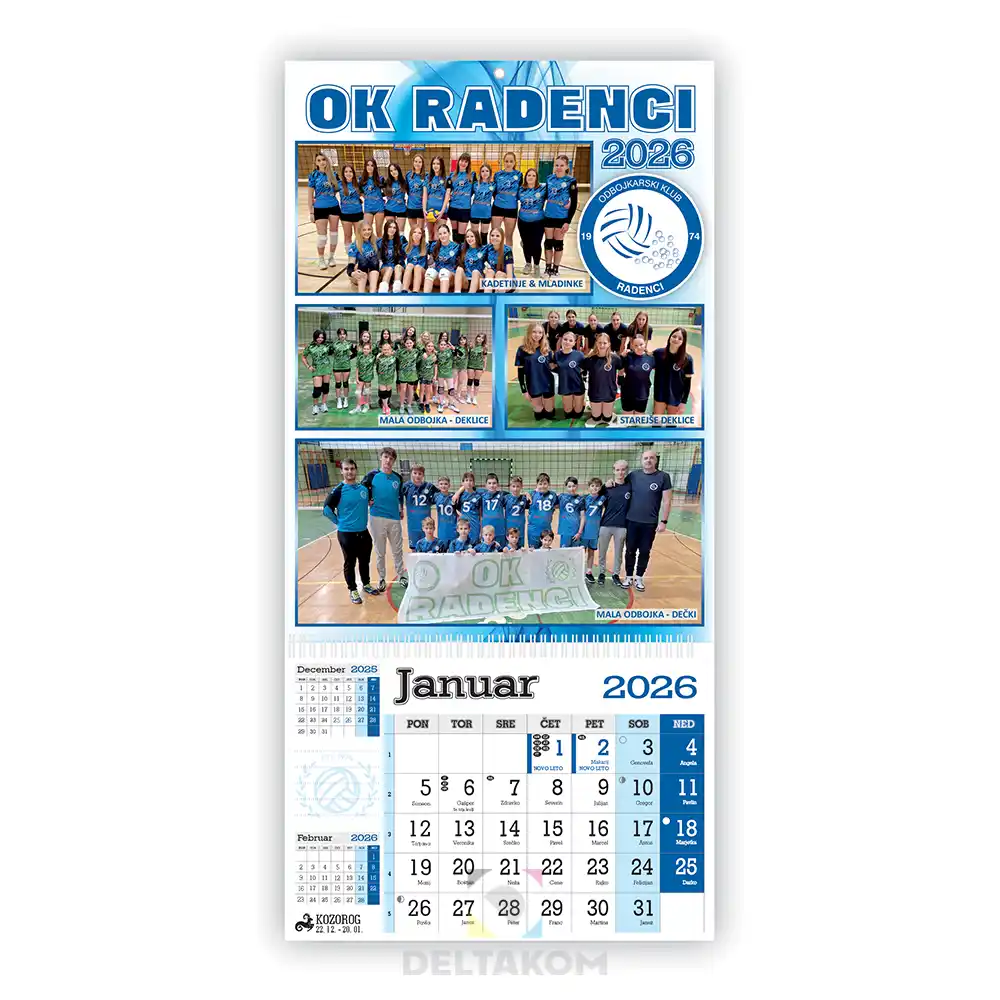 Koledar 12-listni nadkarton 2026 je klasična izbira za društva in klube. Zgornji del je izdelan iz kakovostnega 300 g mat kartona, spodnji del pa iz 80 g brezlesnega papirja. Spiralna vezava in rinka za obešanje omogočata enostavno uporabo in preglednost skozi celo leto.