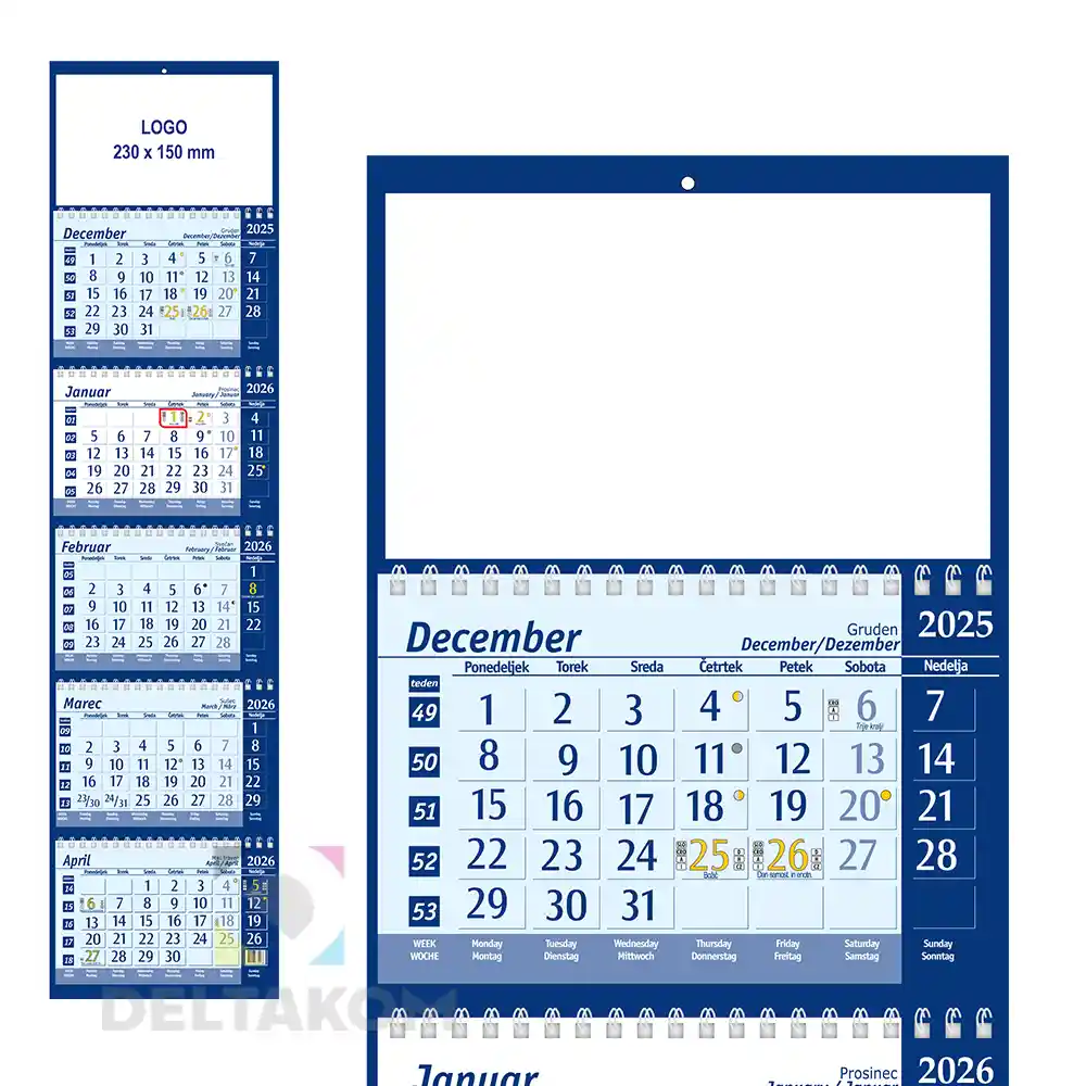 Koledar poslovni špiralni 5-delni moder 2026, velikost 24,5 × 102 cm, spiralna vezava, 12 listov, petmesečni pregled, označeni prazniki in lunine mene. Prostor za dotisk logotipa (23 × 15 cm) na zgornjem robu.