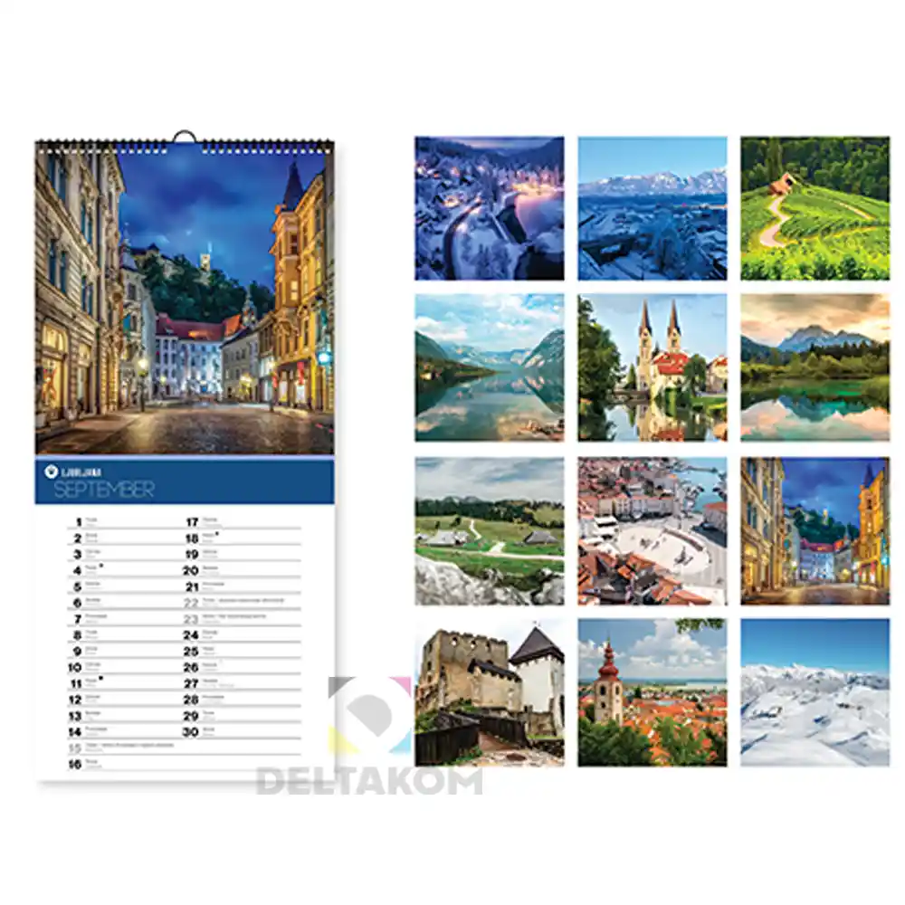 Stenski koledar Lepa Slovenija 2026 z izjemnimi fotografijami slovenskih pokrajin. 13 listov, spiralna vezava, prostor za zapiske in možnost dotiska logotipa.