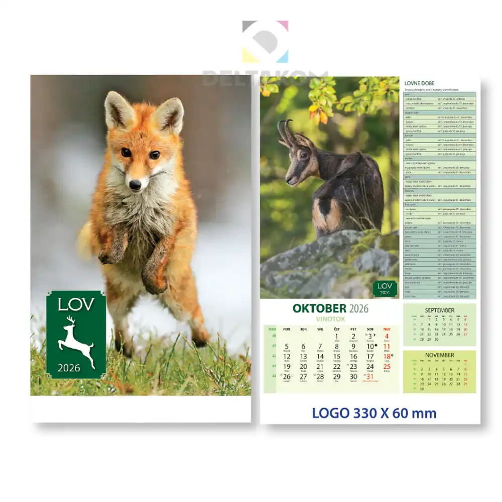 Če želite, lahko spodnji bel rob koledarja LOV 2026 oblikujete z vašim logotipom ali sporočilom.