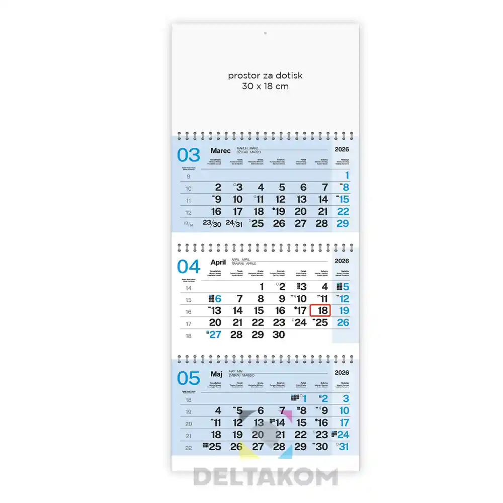 Koledar 3-DELNI ŠPIRALNI svetlo moder 2026 – poslovni stenski koledar