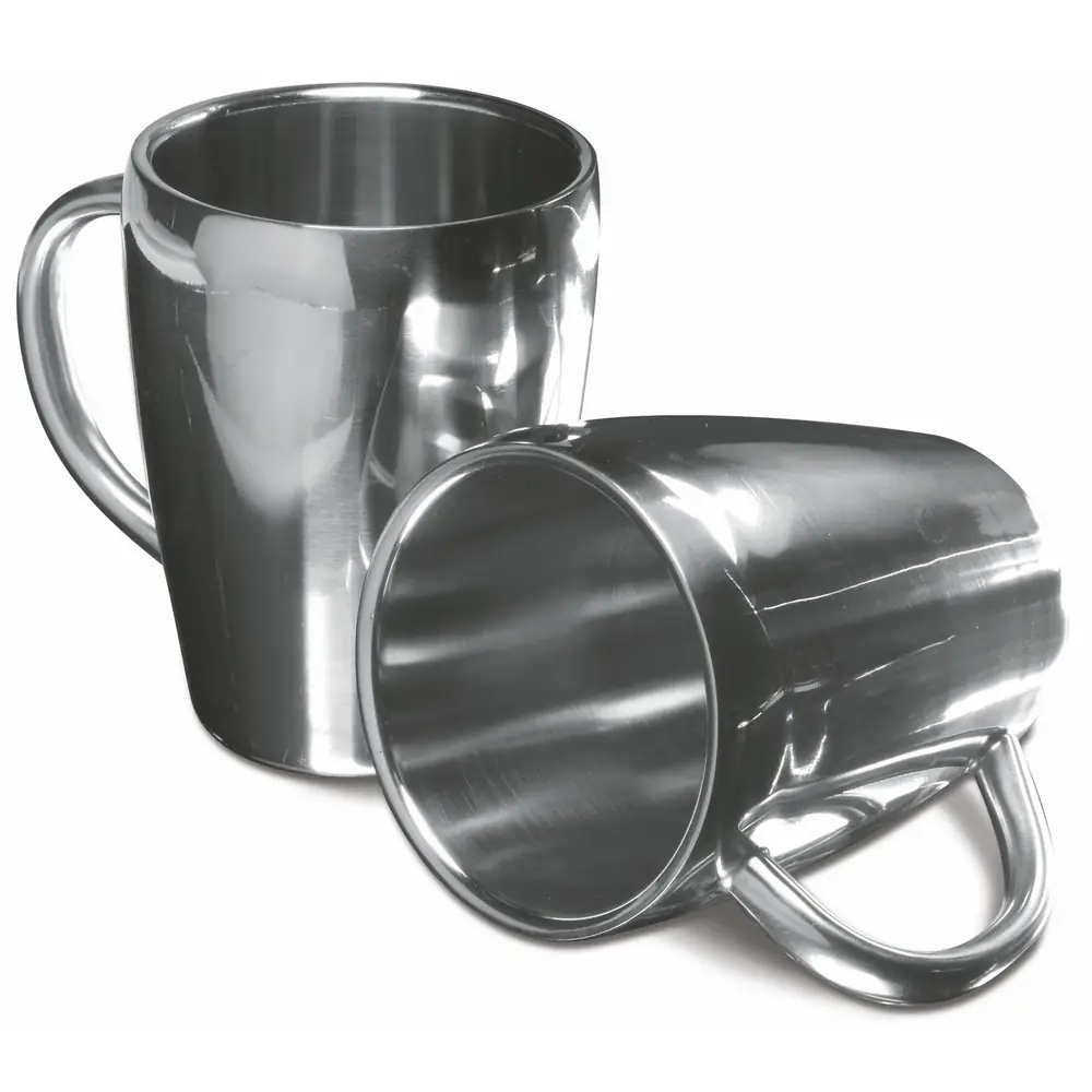 Komplet 2 vrčev 200 ml, z dvojno steno, iz nerjavečega jekla Material: nerjaveče jeklo (201). Dimenzije: 7,3 x 9,2 cm.