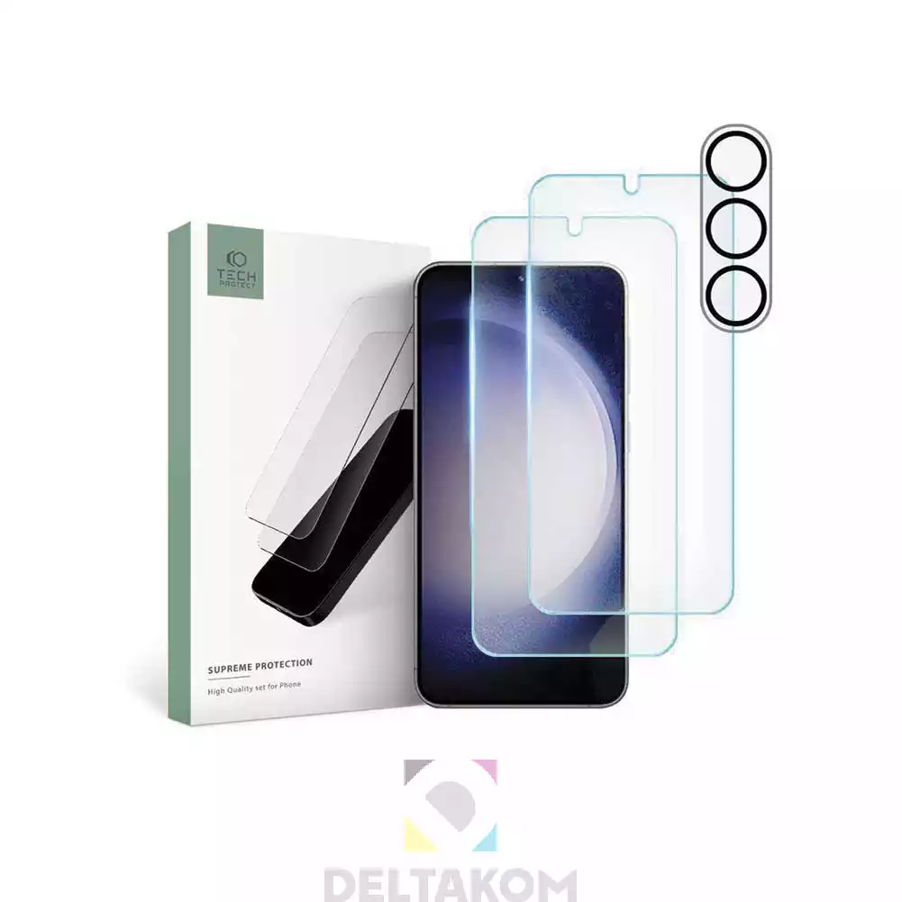 Komplet kaljeno steklo in steklo za kamero TECH-PROTECT za Samsung Galaxy S23. 9H zaščita zaslona in kamere, oleofobni premaz in enostavna namestitev.