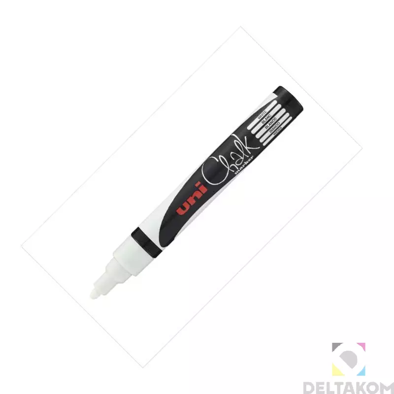 Opis Kredni flomaster UNI bel na vodni osnovi, vodoodporen po sušenju, vendar ga je enostavno odstraniti z vlažno krpo.