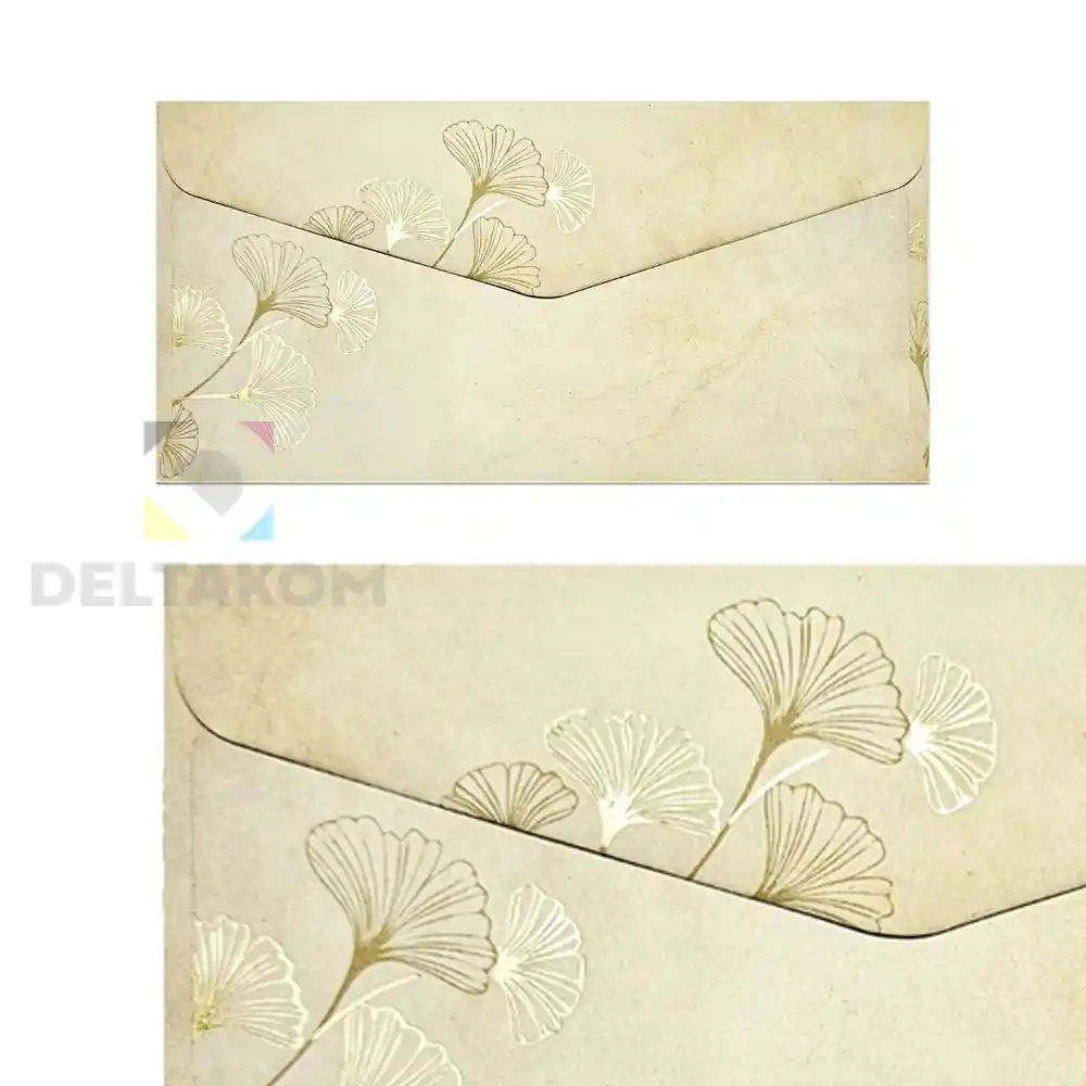 Kuverta DL GINKO, 110 × 220 mm, 120 g. Elegantna dekorativna kuverta s potiskom listov ginka, mokro zapiranje, popolna za pisma, vabila in voščilnice.Papir GINKO si lahko ogledate TUKAJ.