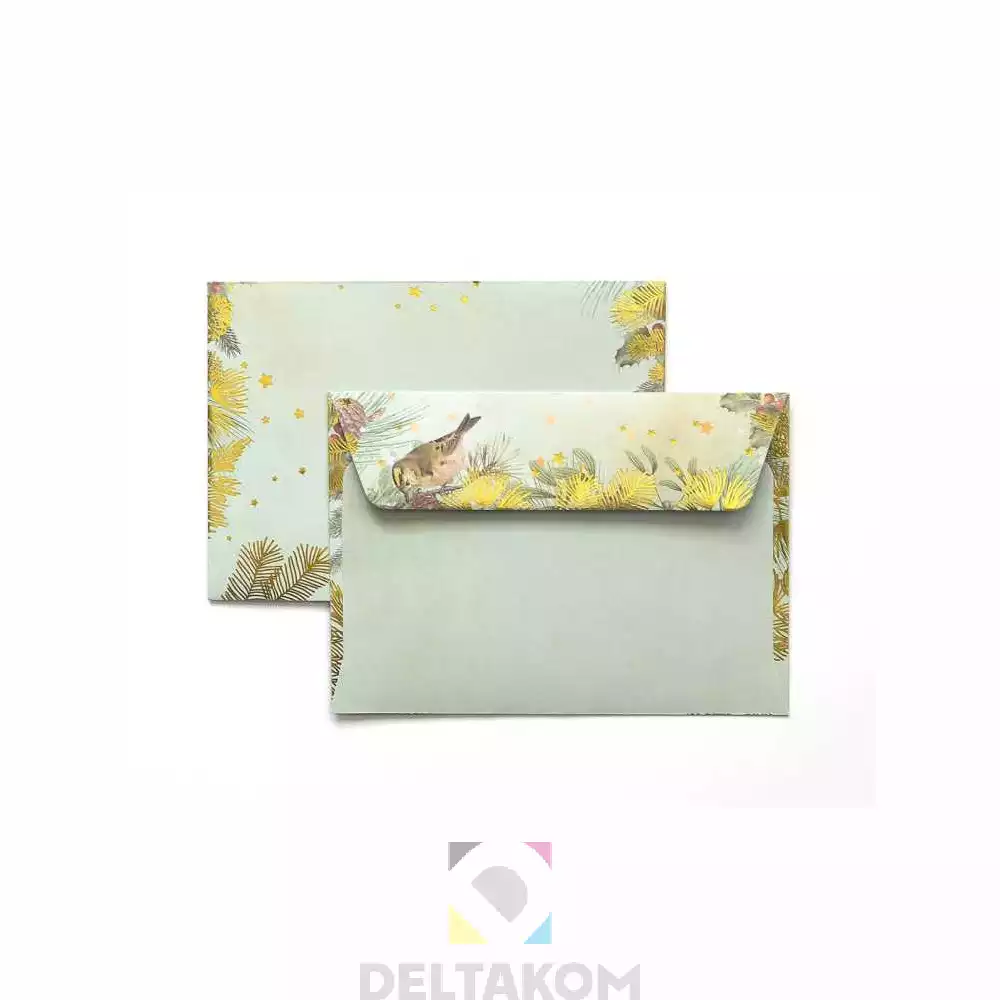 Kuverta C6 GOLD CHRISTMAS je izdelana iz kakovostnega 120 g papirja in okrašena z božičnim motivom, narejenim z vročim žigom in svetlečo zlato folijo. Prefinjena izdelava ji daje prazničen videz, zato je odlična izbira za božične voščilnice, darilne kartice in slavnostna vabila. Mokro zapiranje zagotavlja praktično uporabo, v zavitku je 10 kosov, cena velja za posamezno kuverto.