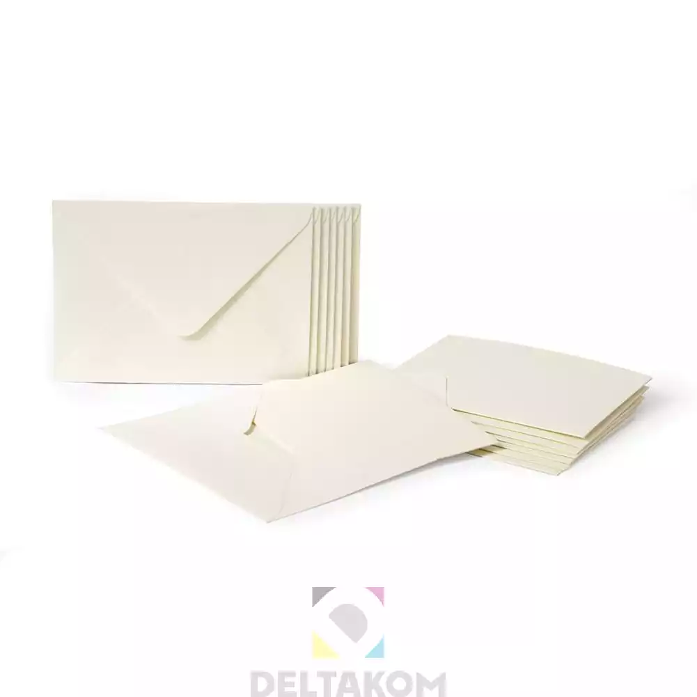 Komplet kuvert C6 (120 g) in prepognjenih kartonov A6 (240 g) v krem barvi. Odličen komplet za izdelavo vabil, voščilnic in ustvarjanje.