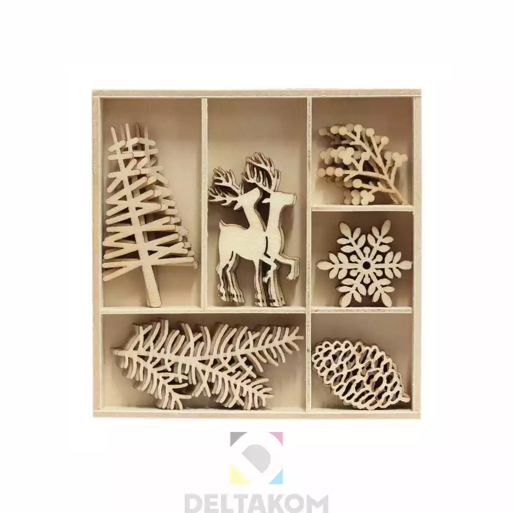 Leseni okraski Božična drevesa in jelenčki v elegantni leseni škatli vključujejo 30 kosov dekoracij v 6 različnih dizajnih. Primerni so za ustvarjalne projekte in praznično dekoracijo, saj s svojo toplino lesa dodajo edinstven čar božičnim aranžmajem.