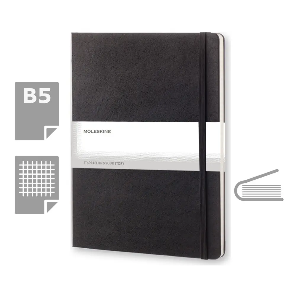 MOLESKINE zvezek XL (približno B5), 192 kvadratnih strani, trda vezava, notranji žep, označevalec s trakom in elastični trak za zapiranje Material: papir, PP. Dimenzije: 19 x 25 cm.