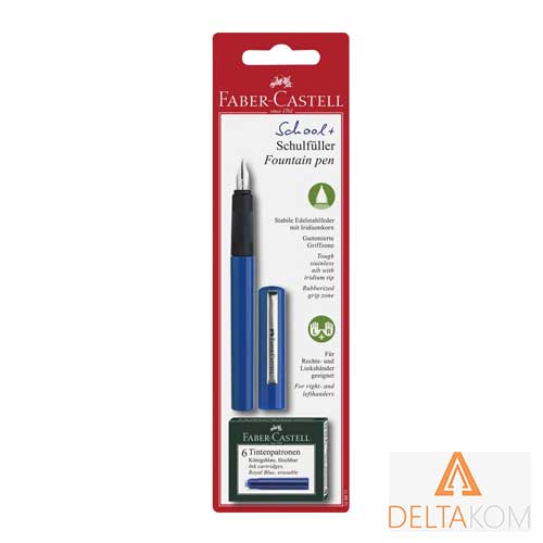 Nalivno pero Faber-Castell z modrimi črnilnimi bombicami – kakovostno pisalo z udobnim oprijemom in gladko konico za tekoče pisanje, primerno za šolo, pisarno in domačo uporabo.