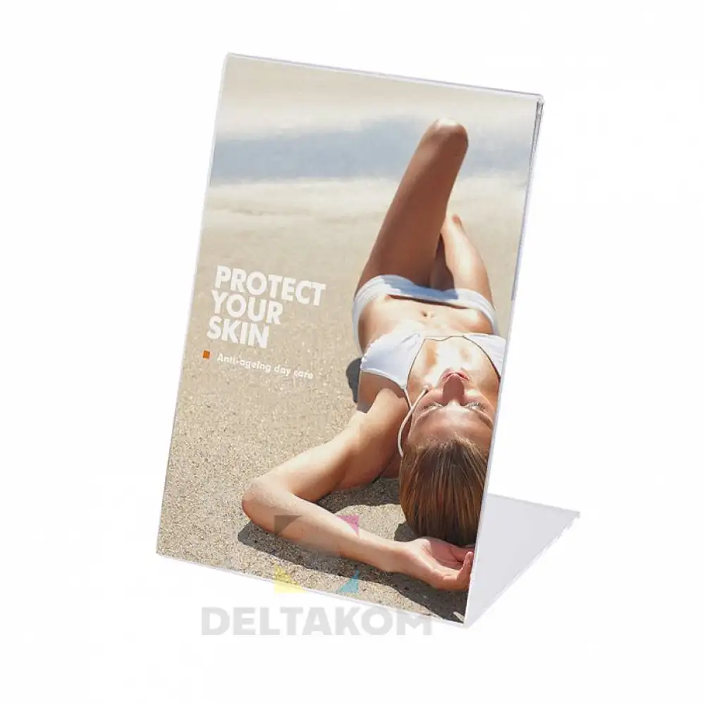 Namizno A3 pokončno stojalo iz prozornega akrilnega stekla (PMMA) je idealna rešitev za elegantno in profesionalno predstavitev cenikov, letakov, obvestil, reklamnih sporočil ali menijev.