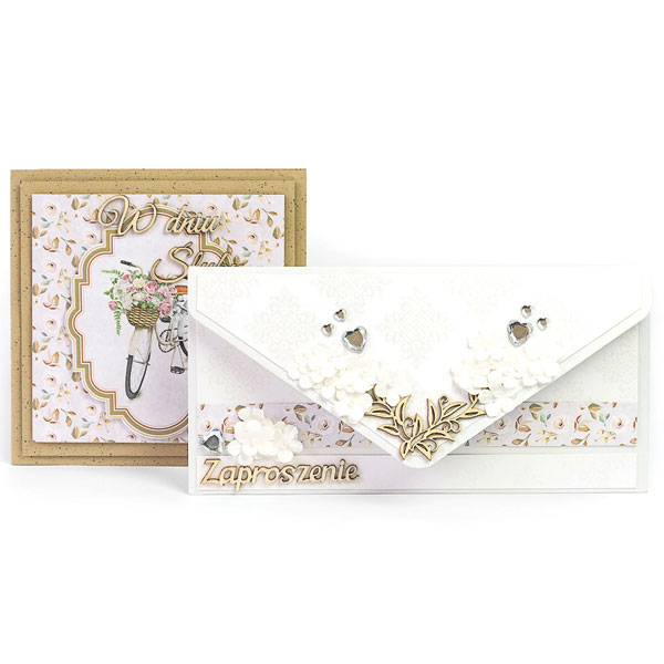 Še en primer izdelkov Galeria: kombinacija kartonskega papirja Poper v rjavi barvi z izrezanimi elementi iz scrapbooking papirja in bele ovojnice Pearl z lepljenim notranjim žepom, okrašeno z nekaj okraski..